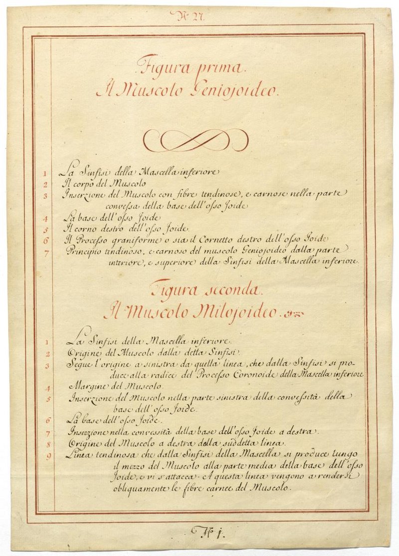 Der Text ist die ergänzende Beschreibung in italienischer Sprache zum anatomischen Wachsmodell der Ober- und Unterzungenbeinmuskulatur.