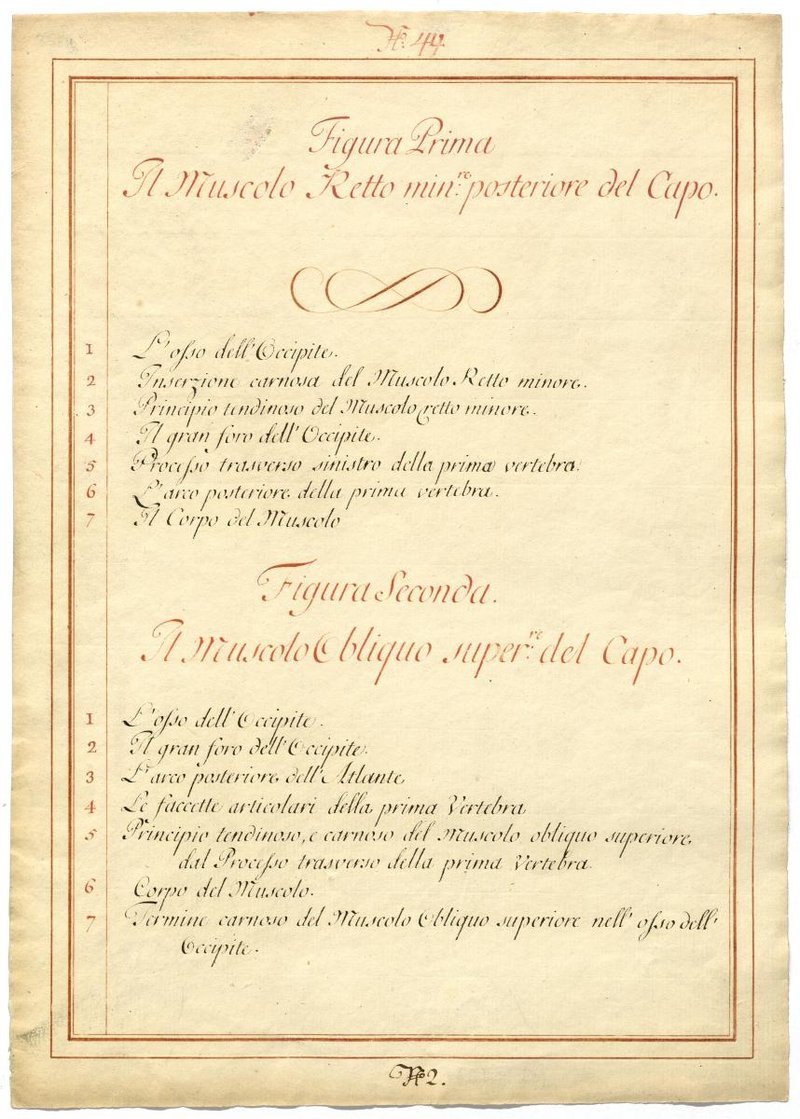Der Text ist die ergänzende Beschreibung in italienischer Sprache zum anatomischen Wachsmodell der kurzen Nackenmuskeln.
