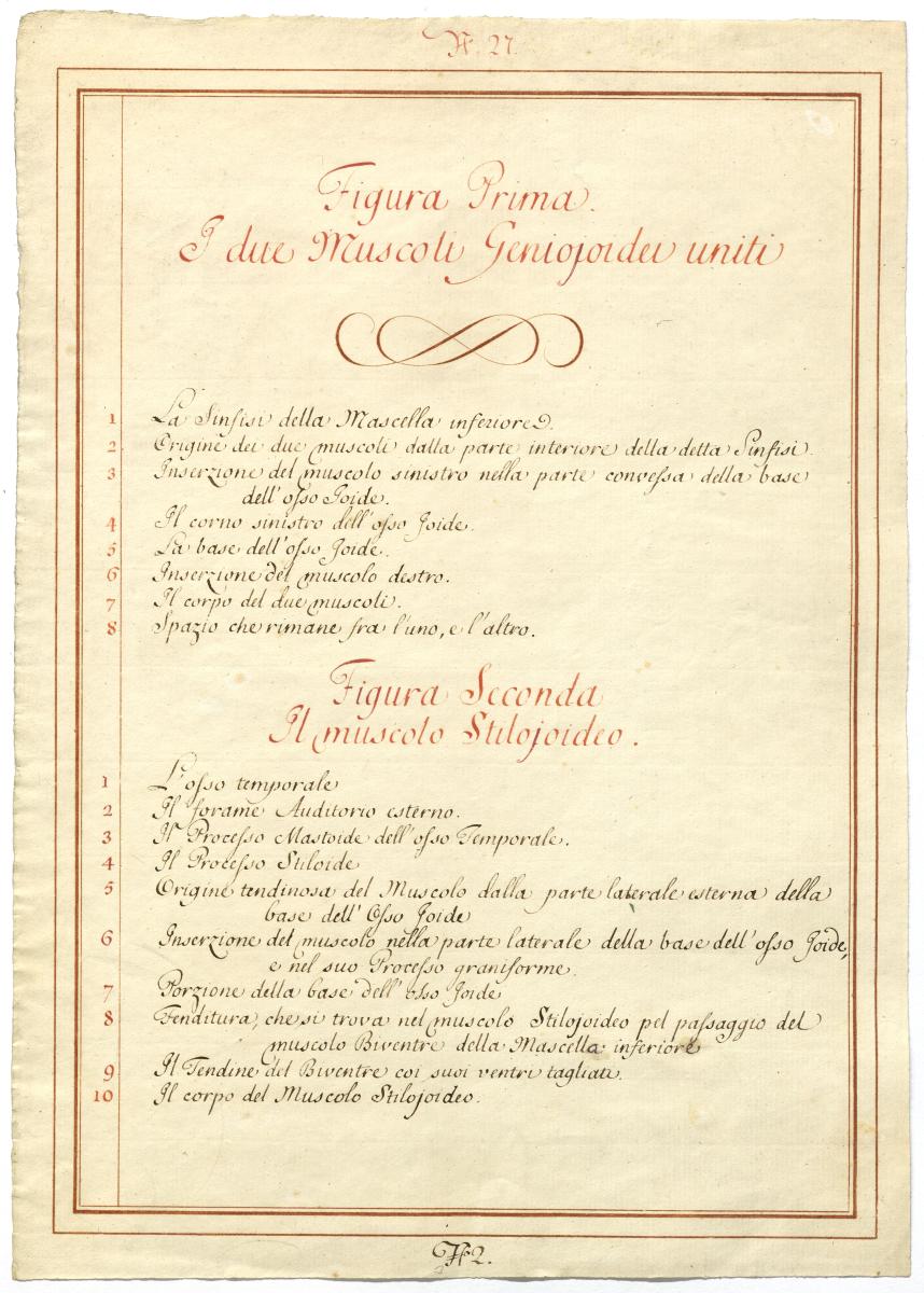 Der Text ist die ergänzende Beschreibung in italienischer Sprache zum anatomischen Wachsmodell der Ober- und Unterzungenbeinmuskulatur.