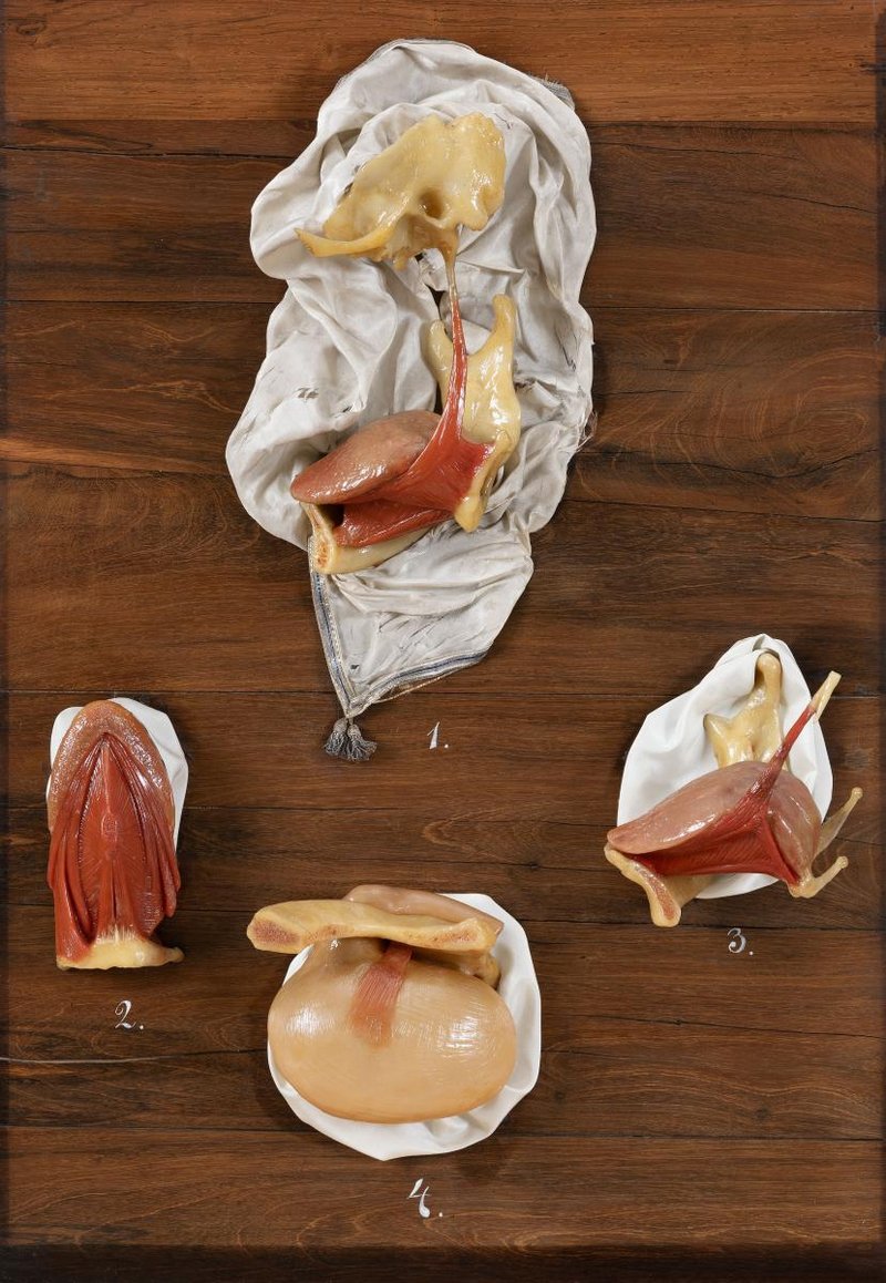 1. In einem isolierten Modell des linken Schläfenbeins, der rechten Unterkieferhälfte inklusive Zunge und des Zungenbeins kommen Musculus styloglossus, Musculus hyoglossus und der tiefe Längsmuskel der Zunge (Musculus longitudinalis inferior) zur Ansicht. 2. Isoliertes Modell der Zunge und des Zungenbeins von unten mit den in sie einstrahlenden Muskeln: Musculus genioglossus, Musculus styloglossus, Musculus hyoglossus und Musculus longitudinalis inferior. 3. Isoliertes Modell des linken Proc. styloideus, der rechten Unterkieferhälfte inklusive Zunge und des Zungenbeins – es Musculus hyoglossus, Musculus genioglossus, Musculus longitudinalis und Musculus geniohyoideus dargestellt. 4. Isoliertes Modell der linken Harnblasenwand, des unteren Schambeinastes in einem männlichen Modell. Der Musculus pubovesicalis ist von der Seite dargestellt. Warum sich dieses Modell in diesem Schaukasten befindet, ist nicht erklärbar.