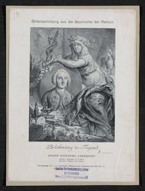 Auszug aus: Kunstbeilage Nr. 2 zur Deutschen Medizinischen Wochenschrift, Nr. 51, 1905. Als Verleger war Georg Thieme, Leipzig, tätig. Im Original handelt es sich um Radierung von Georg Friedrich Schmidt aus dem Jahr 1757. Vorderseitig mit einem Stempel des Institutes für Geschichte der Medizin, Wien, versehen.
