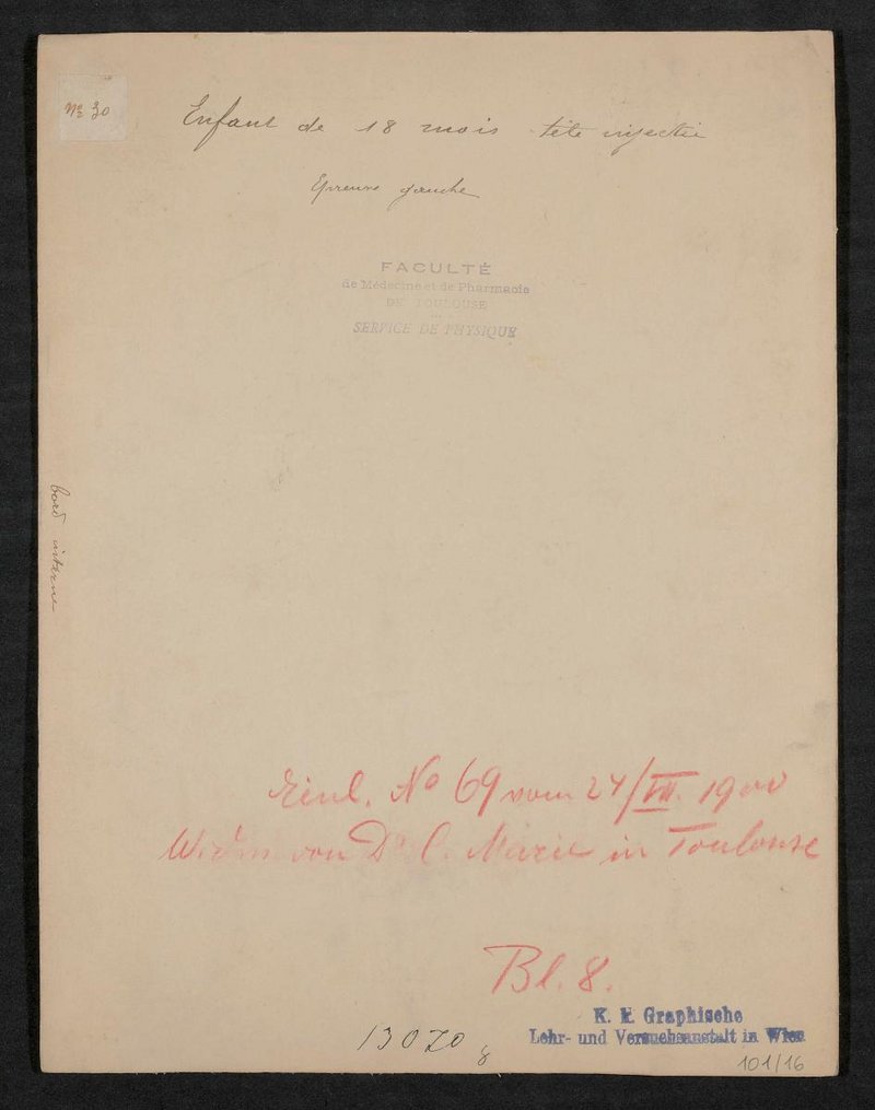 Die Fotografie wurde vom Physikalischen Dienst der Fakultät für Medizin und Pharmazie, Toulouse, erstellt. Rückseitig mit Hinweisen versehen: Herkunftsstempel des Physikalischen Dienstes der Fakultät für Medizin und Pharmazie, Toulouse; Epreuve droite (=Probe rechts); Bord interne (=innerer Rand); No. 30; Einl. No. 69 vom 24. VII. 1900, Widmung von Dr. C. Marie in Toulouse; Bl. 8; Stempel der K.k. Graphische Lehr- und Versuchsanstalt in Wien, Nr. 13070 g.