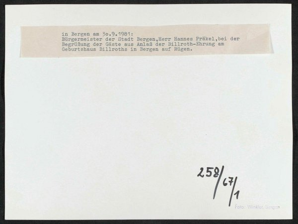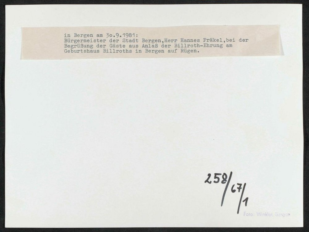 Mit Erläuterungen auf der Rückseite. Die Fotografie wurde von Karl Ludwig Winkler, Bergen auf Rügen, angefertigt. Die Gedenktafel war von der Gesellschaft für Chirurgie der DDR und der Österreichischen Gesellschaft für Chirurgie gestiftet worden.