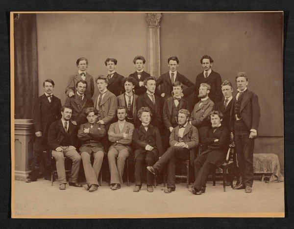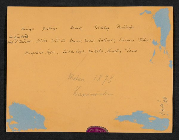 Auf der Rückseite des Bildes sind die Namen Reininger, Gansmayr, Schwarz, Eiselsberg, Pesendorfer, Weitzenböck, Haderer, Müller, Wadikh, Starer, Kaan, Ruthner, Sommer, Faber, Meingassner, Egger, Loitlesberger, Kriehuber, Nemetzy und Tenne genannt. Neg. (9x12) 445