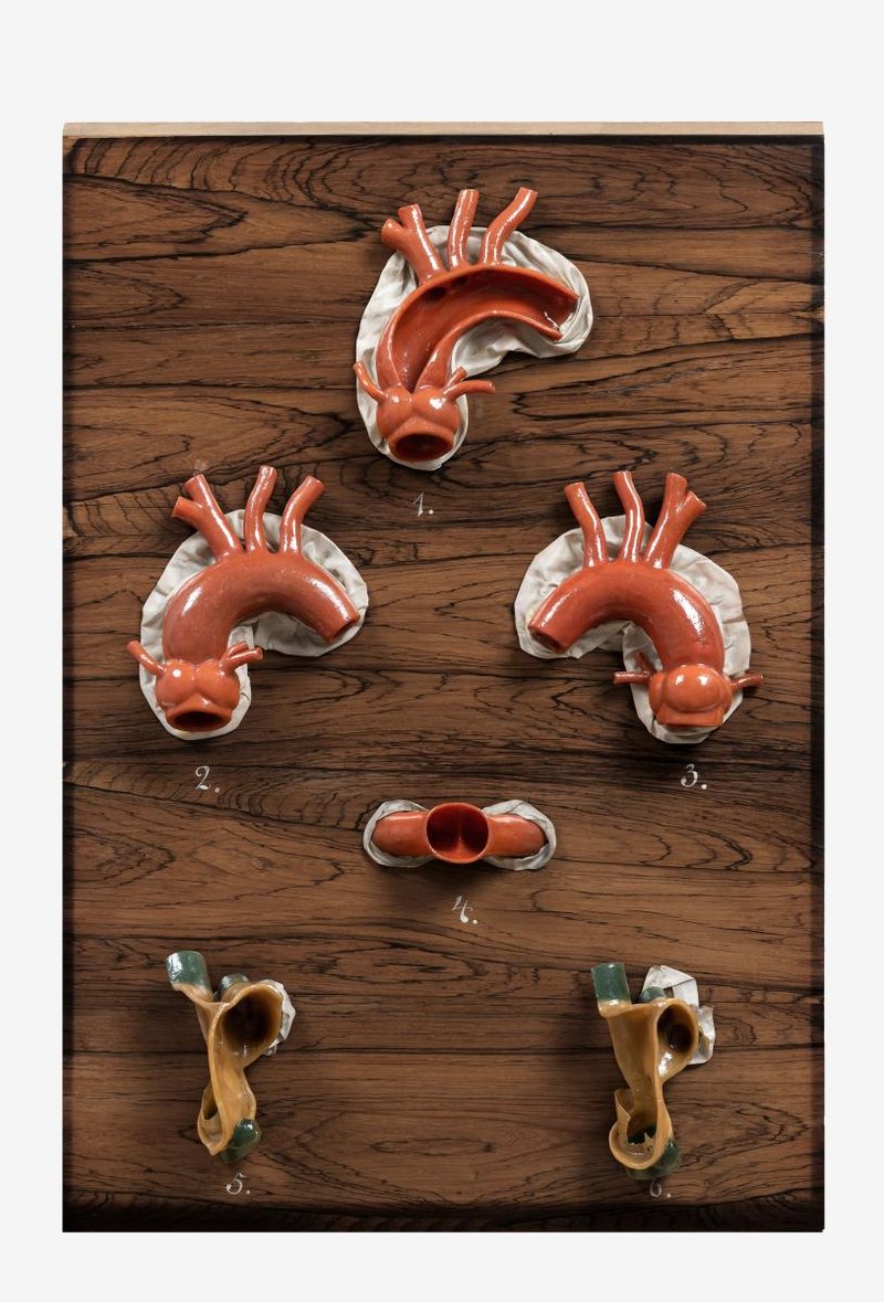 1. Der aufsteigende Teil der Hauptschlagader (Aorta ascendens) mit dem Sinus aortae und den Abgängen der Herzkranzarterien sowie der durch einen Längsschnitt eröffnete Bogen (Arcus aortae). Als Varietät sind zwei linke Herzkranzarterien (Arteriae coronariae cordis sinistrae) dargestellt. 2. Der Bogen der Hauptschlagader (Arcus aortae) mit dem Sinus aortae und seine Äste, von vorne. 3. Der Bogen der Hauptschlagader (Arcus aortae) mit dem Sinus aortae und seine Äste, von hinten. 4. Der Stamm der Lungenschlagader (Truncus pulmonalis) mit seiner Aufteilung in rechte und linke Pulmonalarterie. 5. Die Vorhofscheidewand (Septum interatriale) mit der Fossa ovalis und der Klappe der unteren Hohlvene (Valvula venae cavae inferioris, Eustachische Klappe) und der Klappe des Sinus coronarius (Valvula sinus coronarii, Thebesische Klappe). 6. Die Vorhofscheidewand (Septum interatriale) mit der Fossa ovalis und der Klappe der unteren Hohlvene (Valvula venae cavae inferioris, Eustachische Klappe) und der Klappe des Sinus coronarius (Valvula sinus coronarii, Thebesische Klappe).