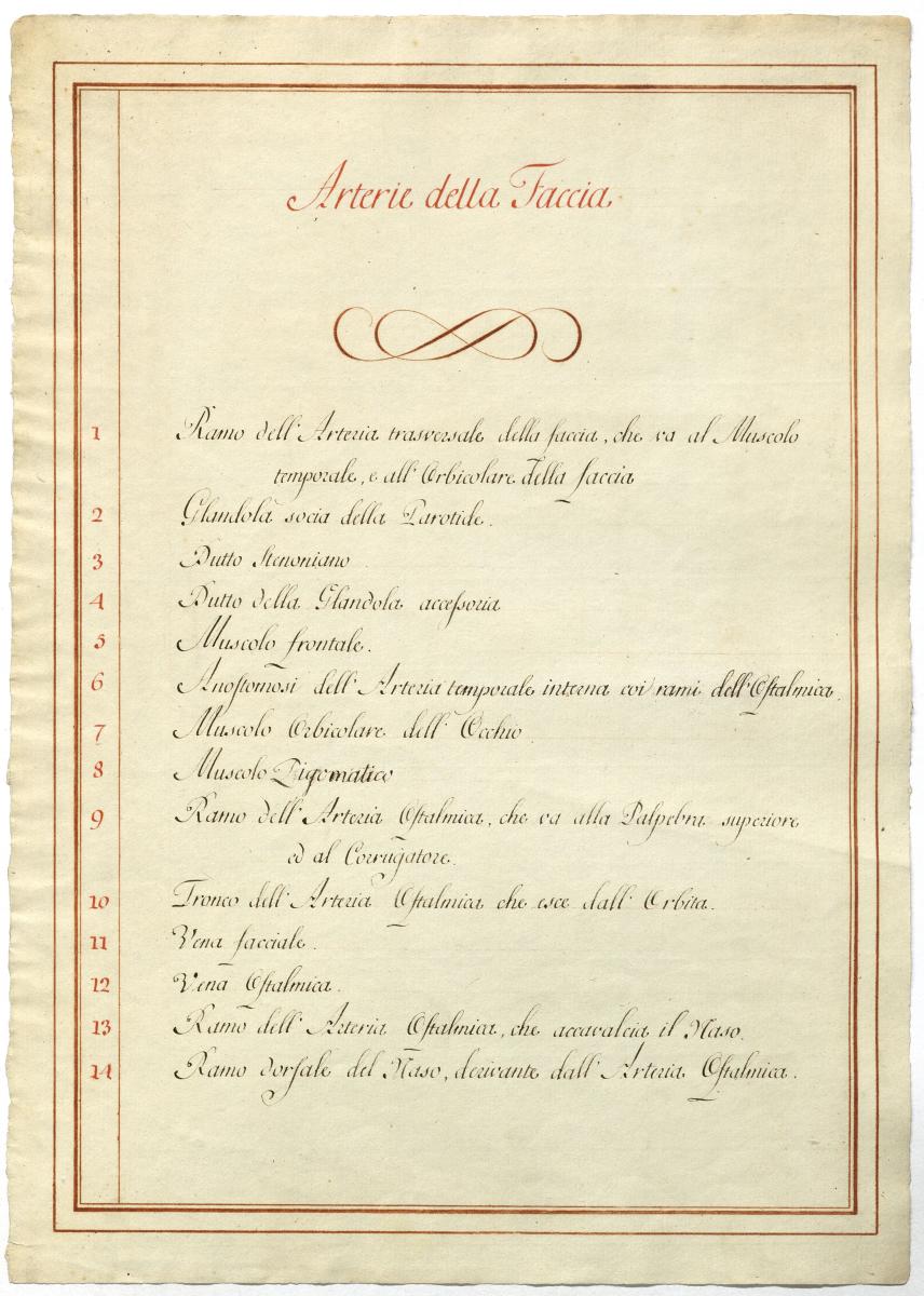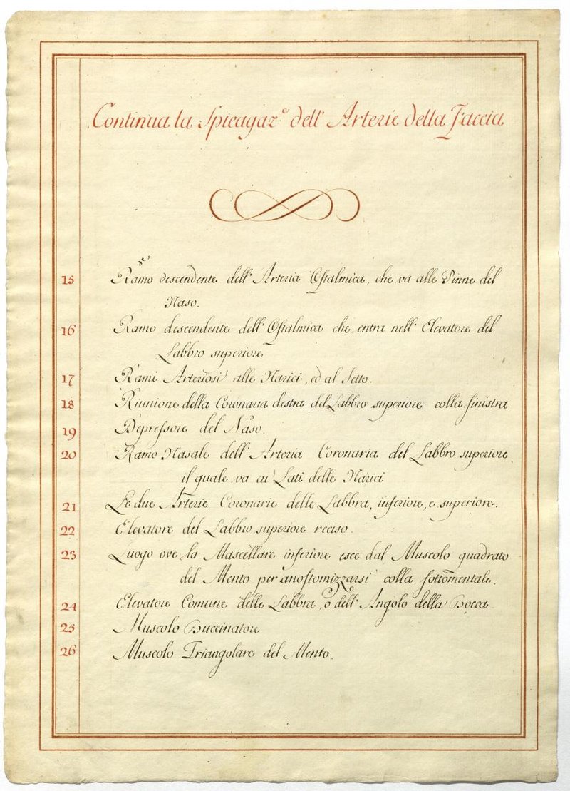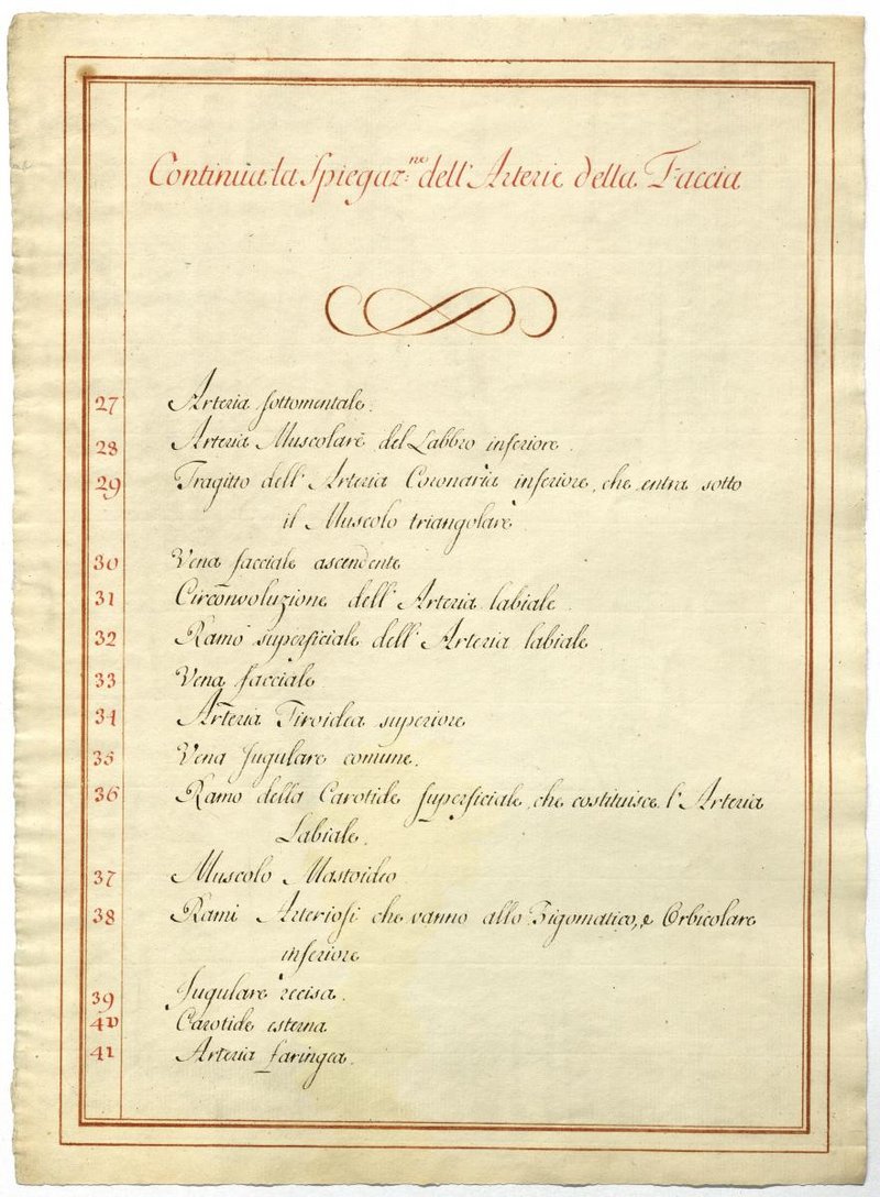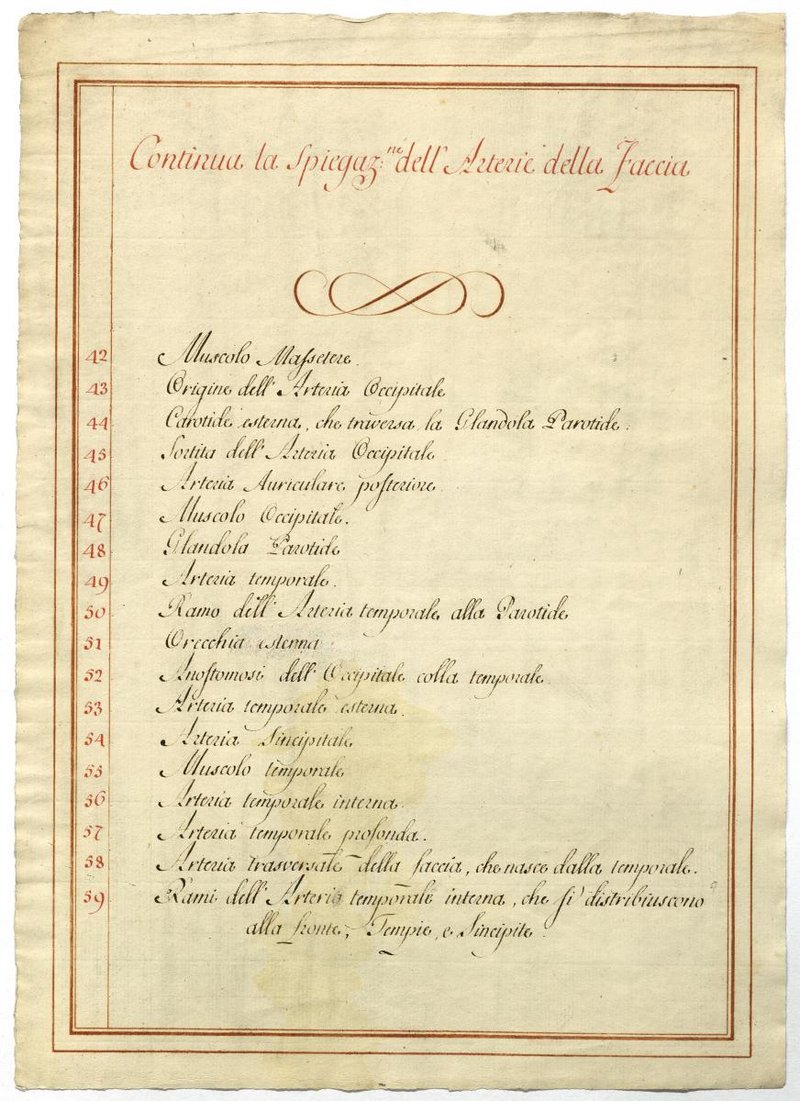 Der Text ist die ergänzende Beschreibung in italienischer Sprache zum anatomischen Wachsmodell der Arteria carotis externa.