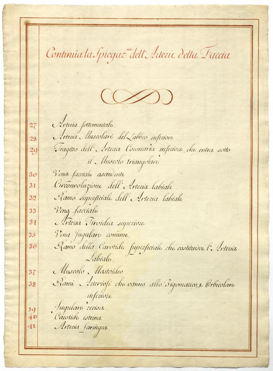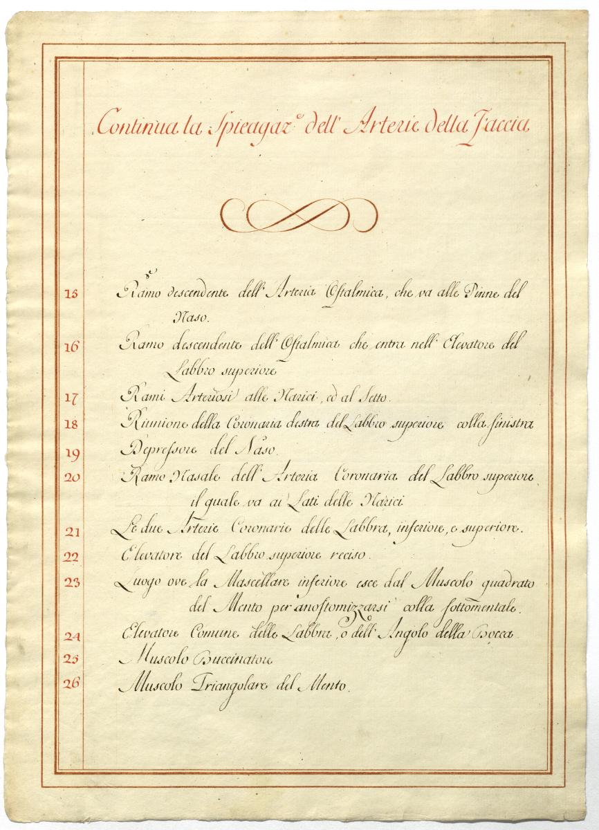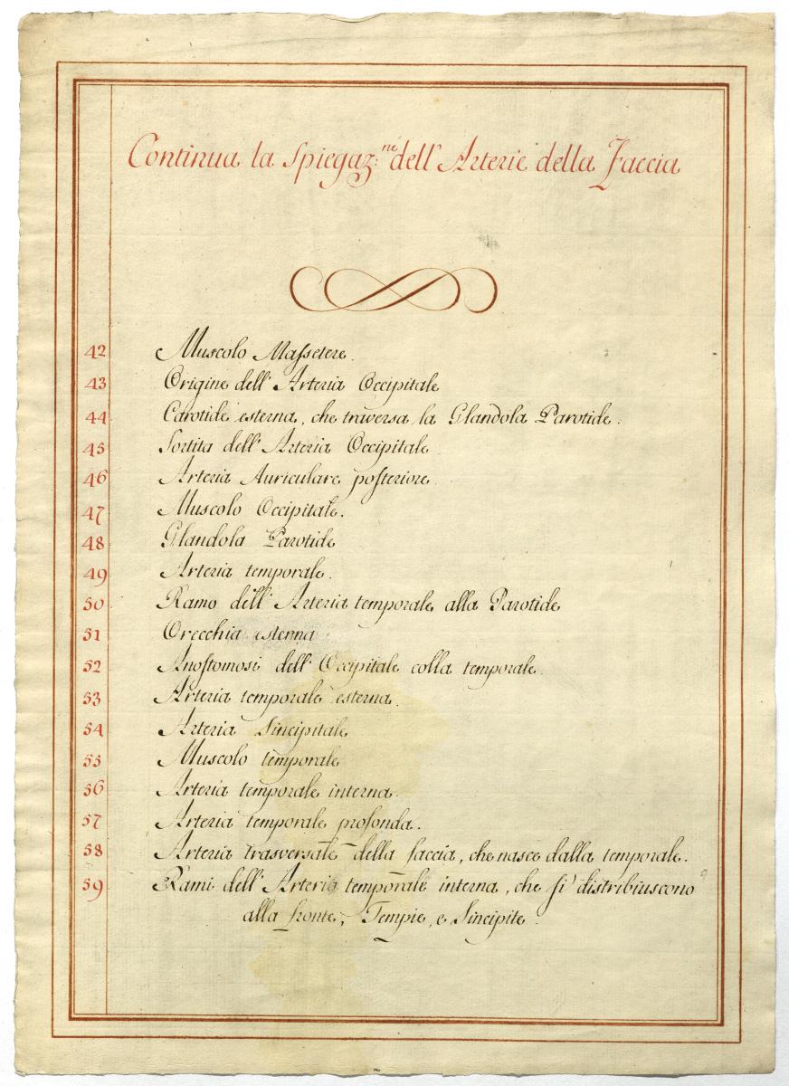 Der Text ist die ergänzende Beschreibung in italienischer Sprache zum anatomischen Wachsmodell der Arteria carotis externa.