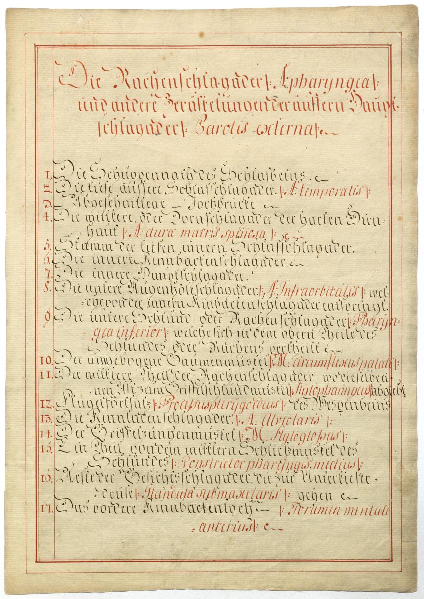 Der Text ist die ergänzende Beschreibung in deutscher Sprache zum anatomischen Wachsmodell der Arteria carotis externa. Blatt 2 und 3 fehlen.