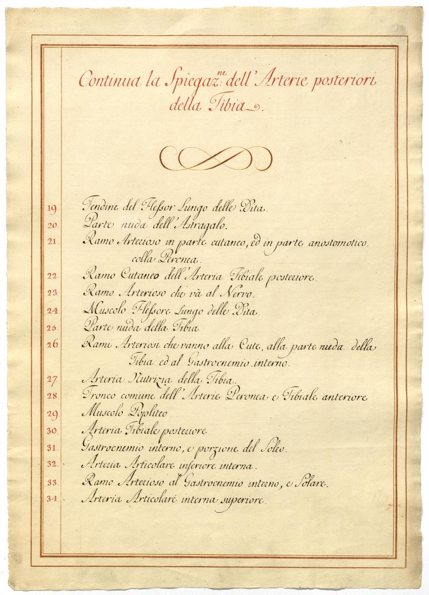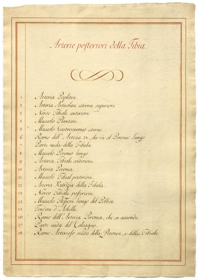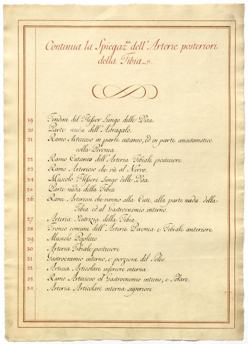 Der Text ist die ergänzende Beschreibung in italienischer Sprache zum anatomischen Wachsmodell der Nervus tibialis und Nervus peroneus (fibularis) communis.