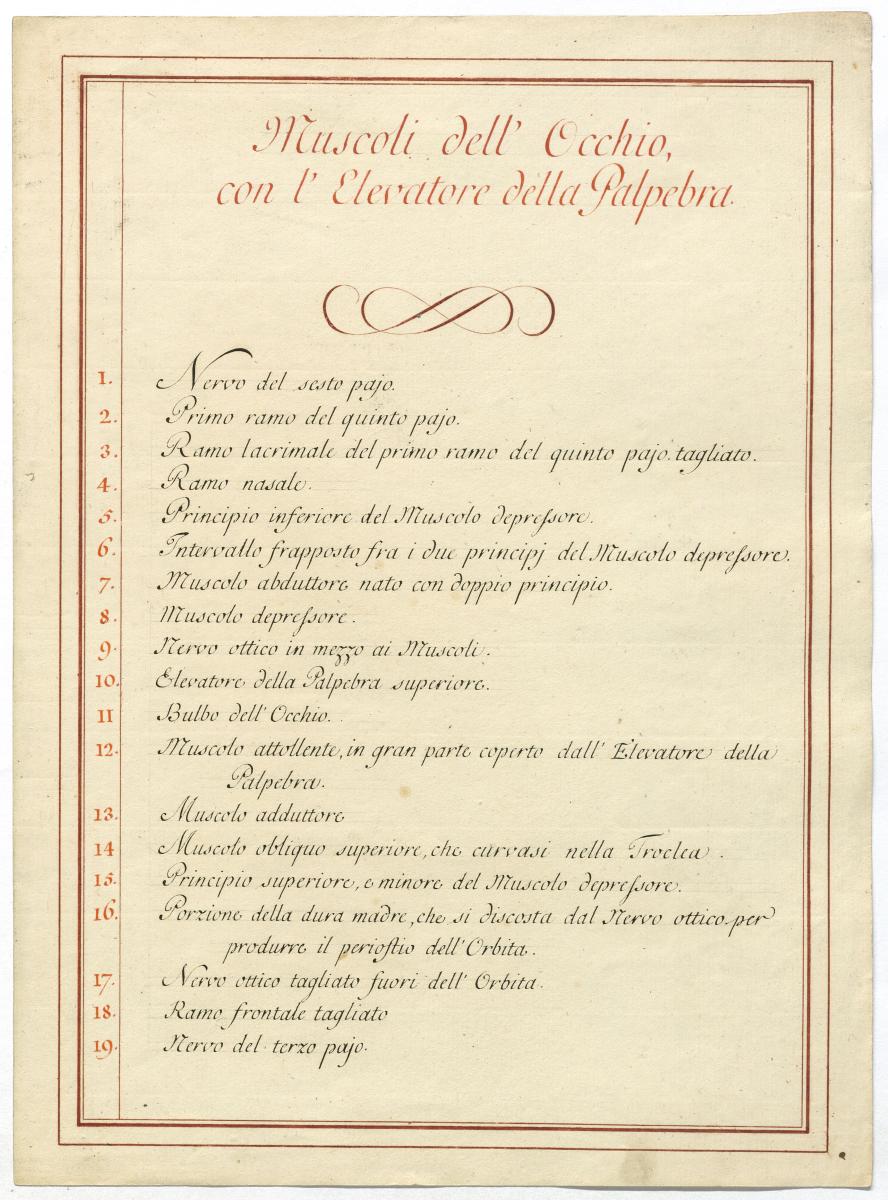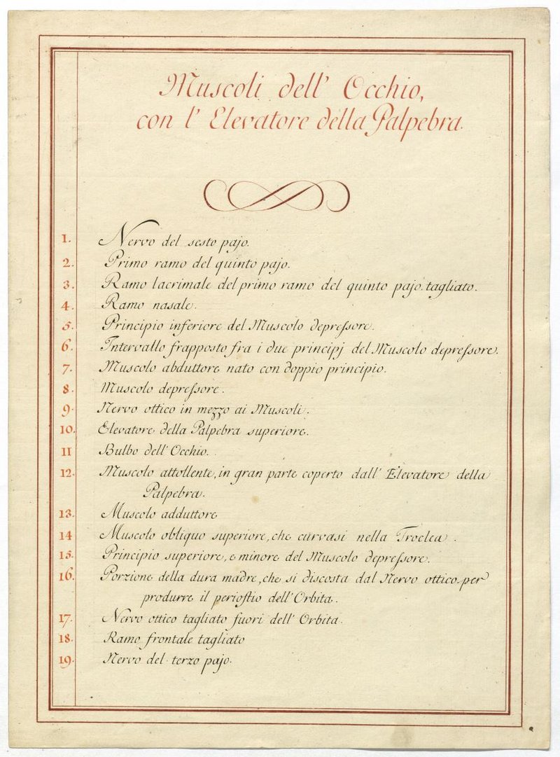 Der Text ist die ergänzende Beschreibung in italienischer Sprache zum anatomischen Wachsmodell der Hilfsmittel des Auges.