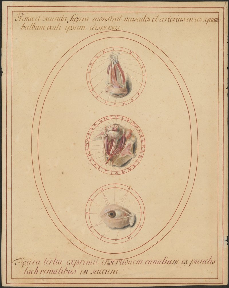 Fig. 1: 321/3: Augenmuskeln (Musculi bulbi) und der Heber des oberen Augenlides (Musculus levator palpebrae superioris). Fig. 2: 321/6: Die Schlagader des Auges (Arteria ophthalmica) und ihre Äste. Fig. 3. 321/9: Die ableitenden Tränenwege: die Tränenpunkte, die Tränengänge, der Tränensack und der Anfangsteil des Tränennasenganges (Puncta lacrimalia, Ductuli lacrimales, Saccus lacrimalis und Ductus nasolacrimalis).