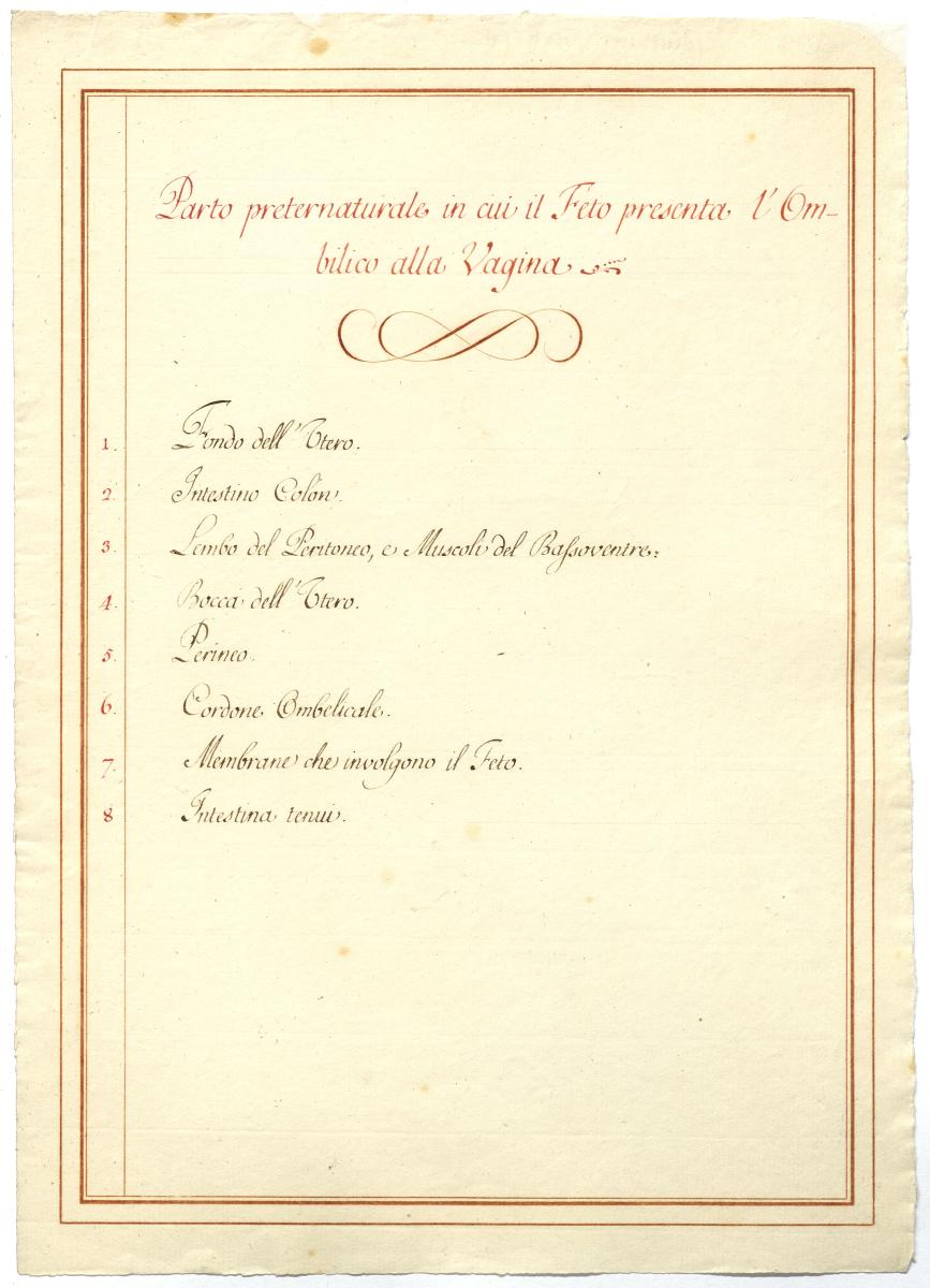 Der Text ist die ergänzende Beschreibung in italienischer Sprache zum anatomischen Wachsmodell unterschiedlicher Geburtenszenarien.