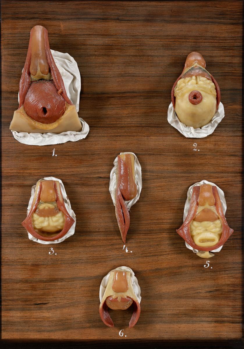 1. Der innere und der äußere Schließmuskel des Afters (Musculus sphincter ani internus und Musculus sphincter ani externus) und der Musculus transversus perinei profundus, der Musculus isehiocavernosus und Venengeflechte (Plexus venosi). 2. Der Musculus levator ani, der innere Schließmuskel des Afters (Musculus sphincter ani internus), die Vorsteherdrüse (Prostata), die Samenbläschen (Vesiculae seminales) und das Ligamentum puboprostaticum. 3. Der Musculus ischiocavernosus, die Harnröhre (Urethra), vom inneren Schließmuskel der Harnröhre (Musculus sphincter urethrae internus) bedeckt, die Vorsteherdrüse (Prostata) und das Ligamentum puboprostaticum). 4. Der Musculus ischiocavernosus und der Musculus bulbocavernosus. 5. Ein Teil des Musculus levator ani, der Musculus ischiocavernosus, die Vorsteherdrüse (Prostata) und die Samenbläschen (Vesiculae seminales). 6. Die männliche Harnröhre (Urethra masculina), quer durchtrennt, mit der Vorsteherdrüse (Prostata) und den Cowperschen Drüsen (Glandulae bulbourethrales) und einem Muskelteil des Musculus levator ani.