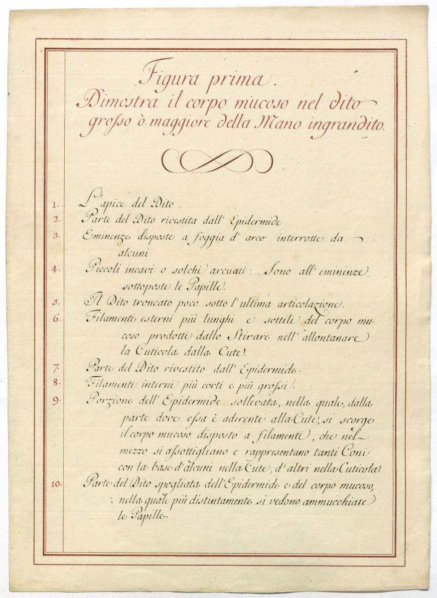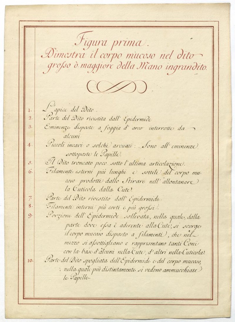 Der Text ist die ergänzende Beschreibung in italiensicher Sprache zum anatomischen Wachsmodell der Haut und Anhangsgebilde.
