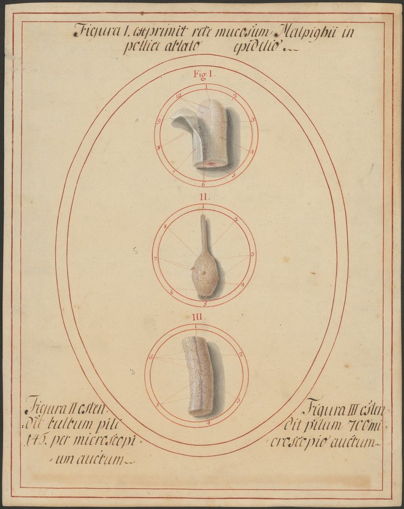 Fig. 1: 315/1: Beugeseite des Daumenendgliedes; auf der einen Hälfte sieht man die Haut mit ihren Furchen und Leisten (Cristae et sulci cutis), auf der anderen wurde die Oberhaut (Epidermis) abpräpariert und zurückgeschlagen. Fig. 2: 315/5: Haarzwiebel (Bulbus pili) mit Wurzel eines Haares, vergrößert dargestellt. Fig. 3: 315/3: Mittel-Teil eines menschlichen Kopfhaares (Capillus), vergrößert dargestellt.
