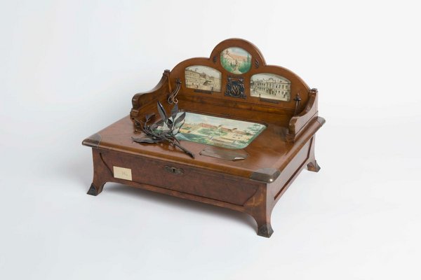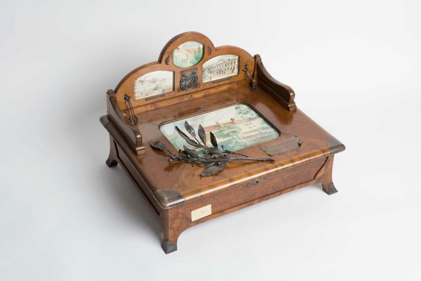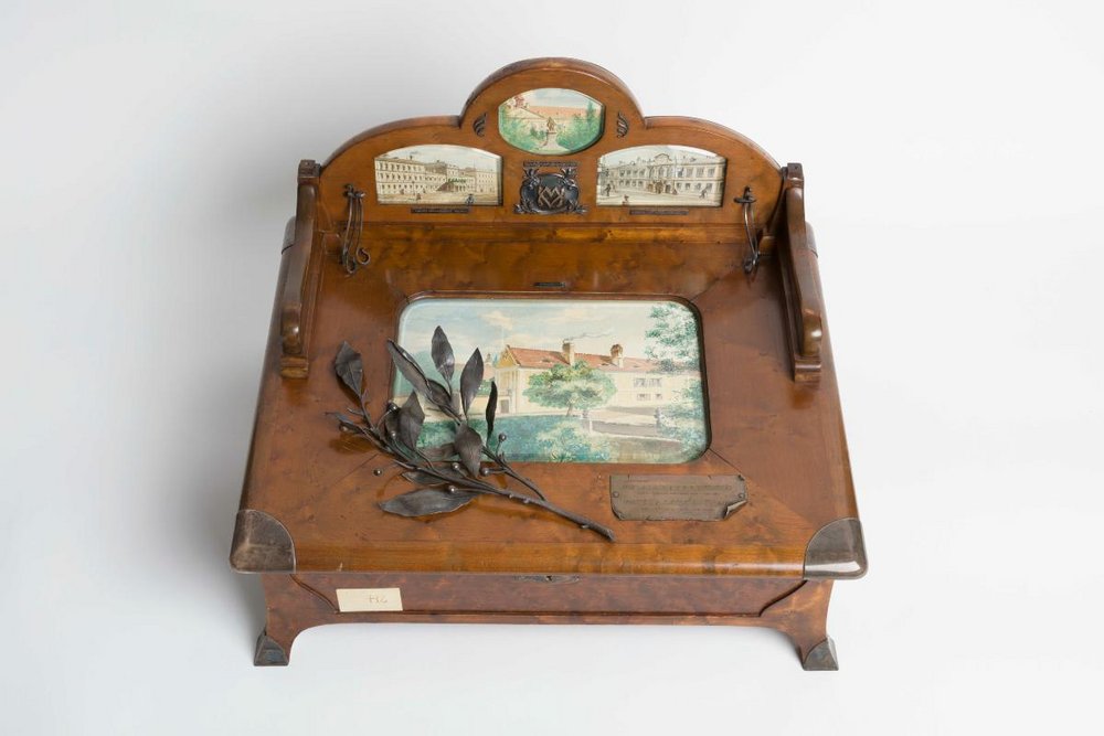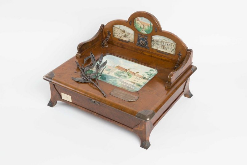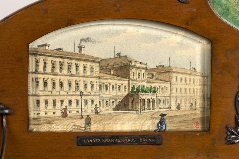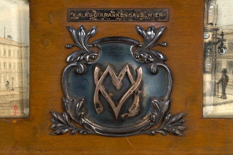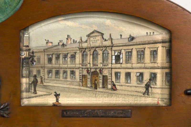 Auf dem Deckel der Kassette sind einige Aquarellzeichnung mehrerer Krankenhäuser zu sehen. Digitalisate des Albums: Reiner Riedler.