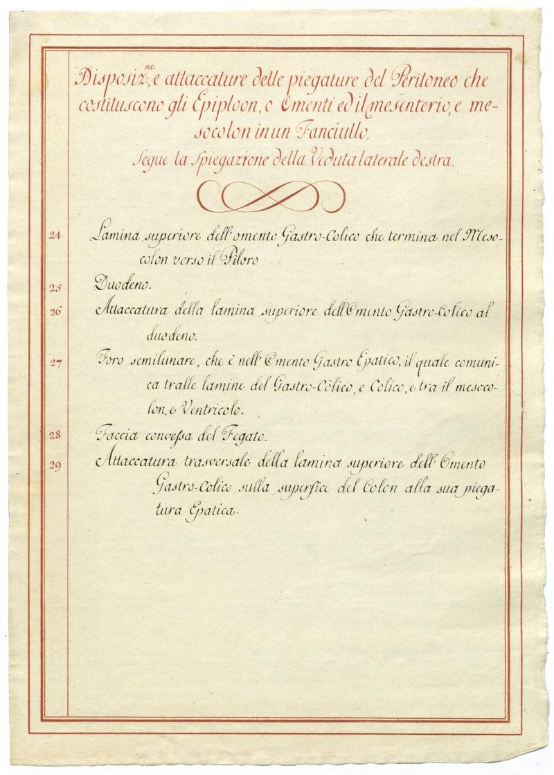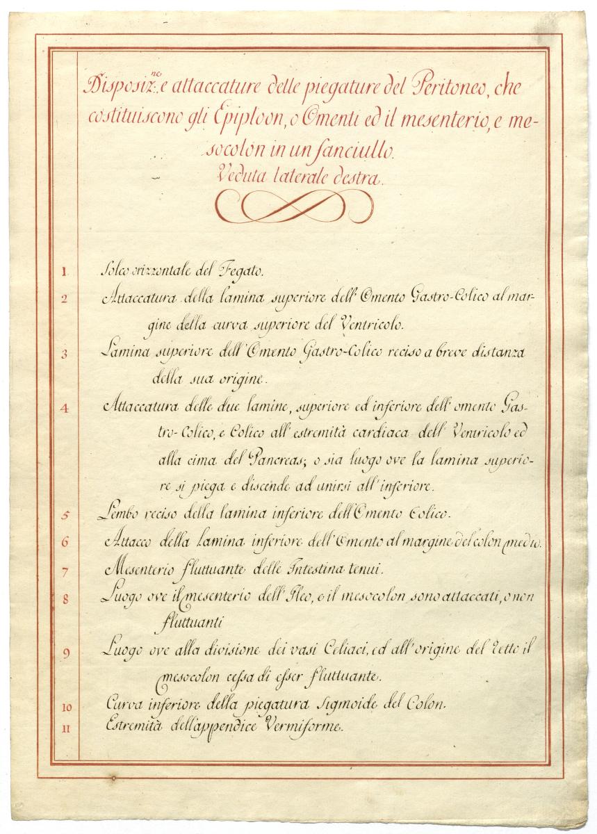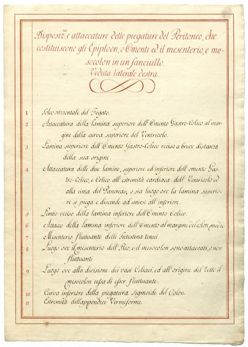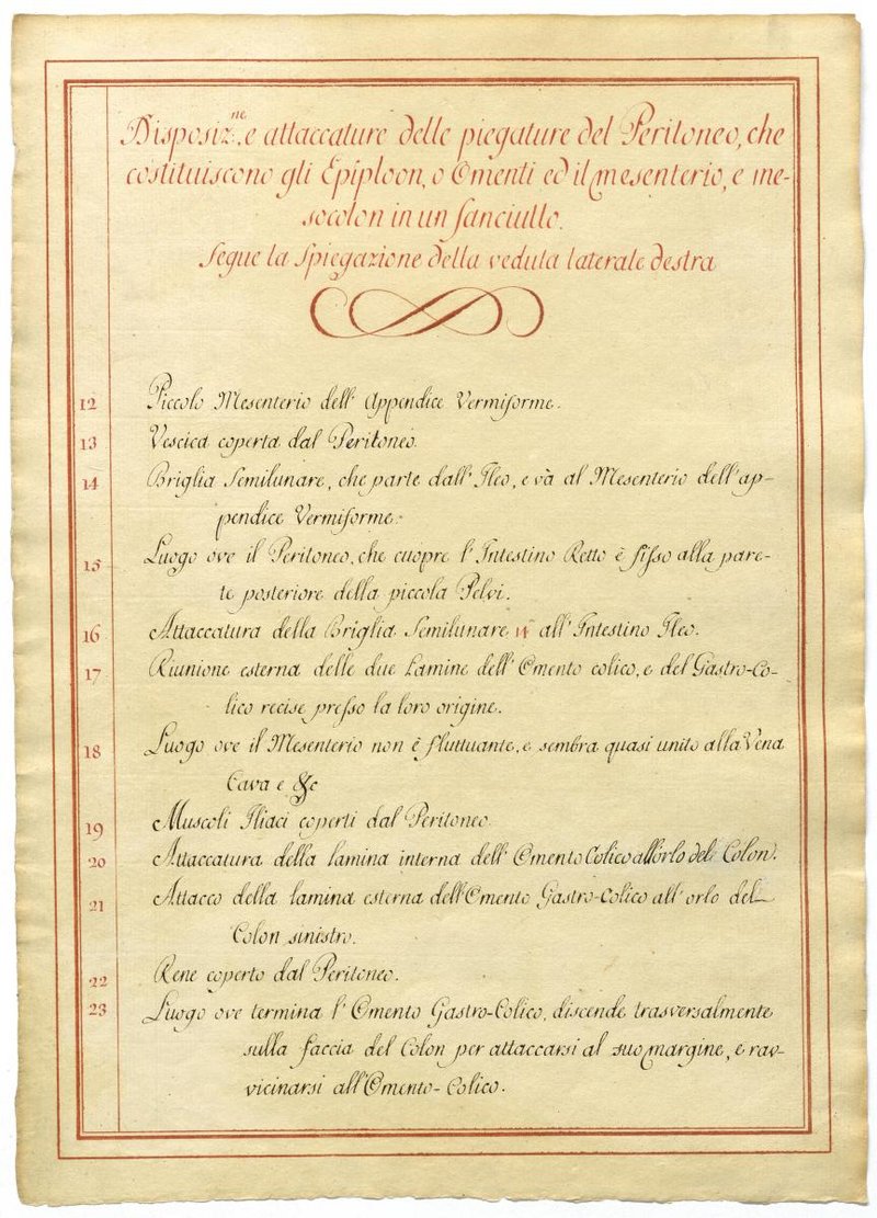 Der Text ist die ergänzende Beschreibung in italienischer Sprache zum anatomischen Wachsmodell der Gefäße des Bauchraums.