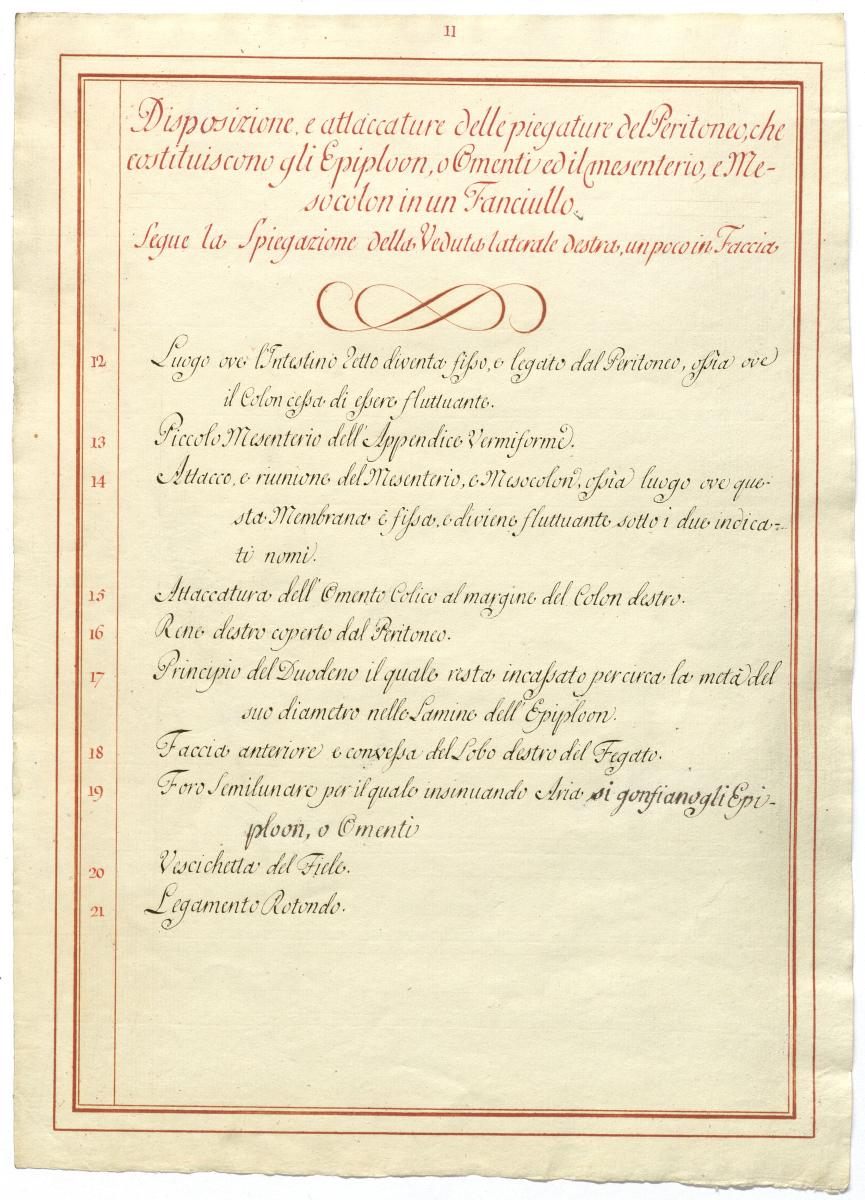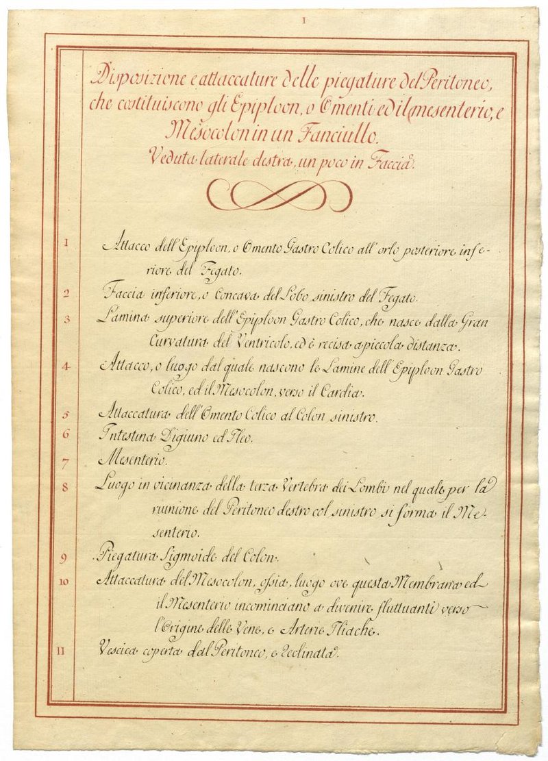 Der Text ist die ergänzende Beschreibung in italienischer Sprache zum anatomischen Wachsmodell der Gefäße des Bauchraums.