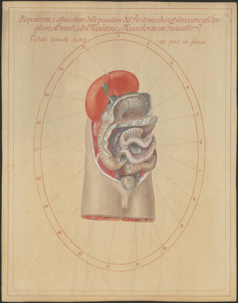 Eröffneter Bauchraum, Leber und Magen sind nach oben geklappt, der Darm ist zum größten Teil entleert und kontrahiert dargestellt, das große Netz (Omentum majus) ist entfernt, das Ligamentum gastrocolicum und somit die Bursa omentalis ist eröffnet. Die Blutgefäße des Magens und des Darms sind dargestellt.