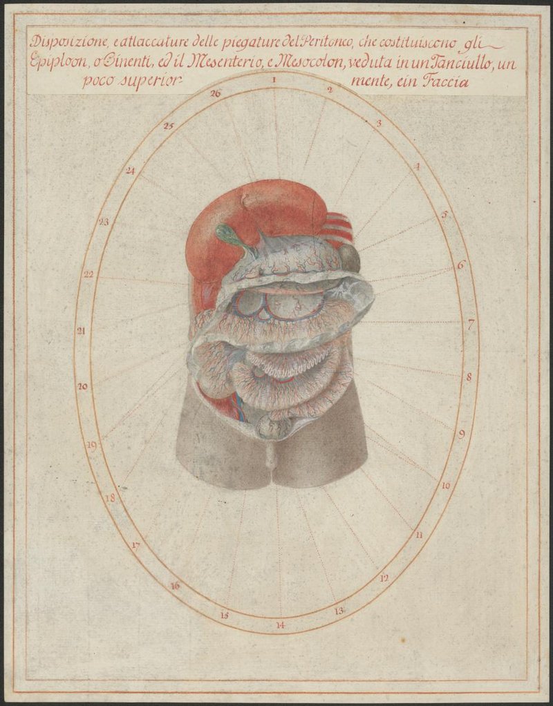 Eröffneter Bauchraum, Leber und Magen sind nach oben geklappt, der Darm ist zum größten Teil entleert und kontrahiert dargestellt, das große Netz (Omentum majus) ist entfernt, das Ligamentum gastrocolicum und somit die Bursa omentalis ist eröffnet. Die Blutgefäße des Magens und des Darms sind dargestellt.