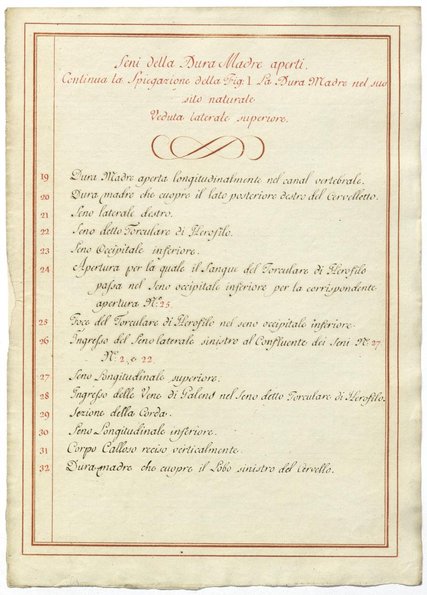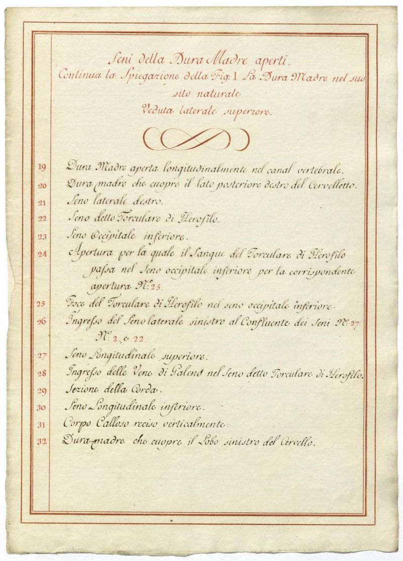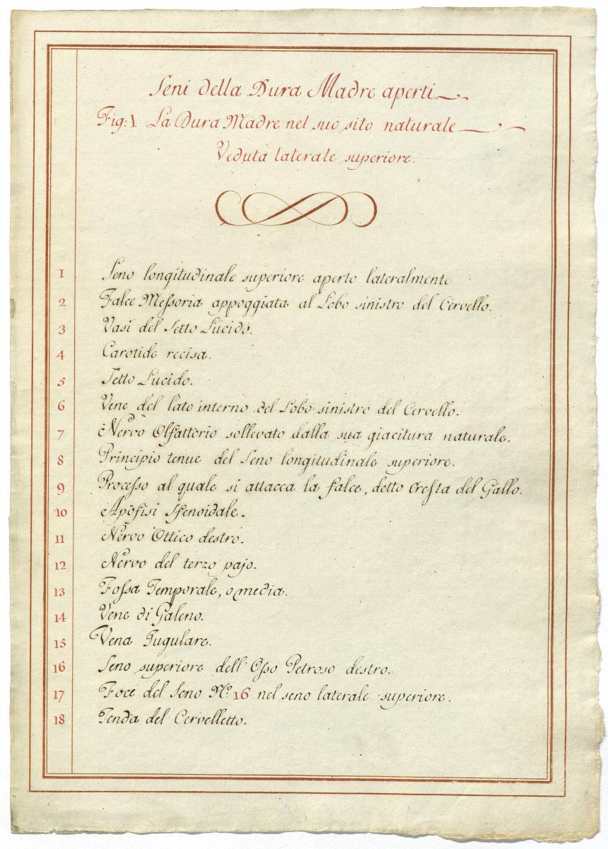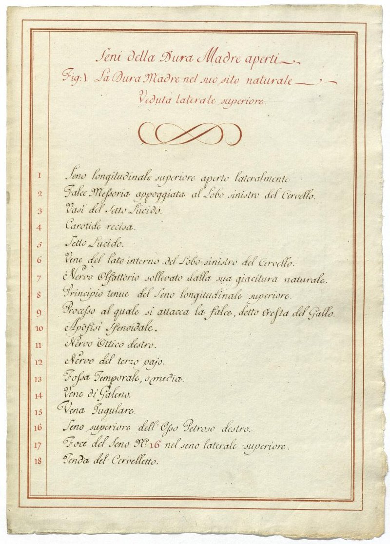 Der Text ist die ergänzende Beschreibung in italiensicher Sprache zum anatomischen Wachsmodell der Hirnvenen.