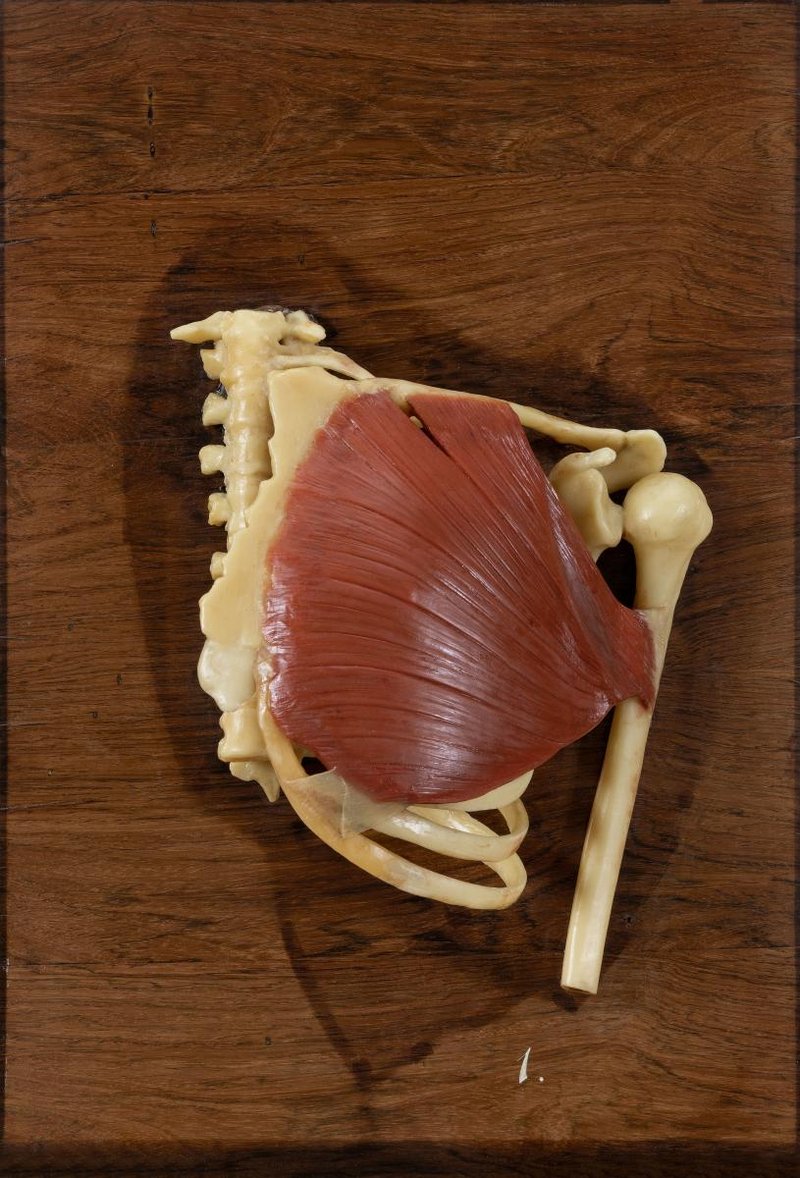 1. Modell des linken Brustkorbs (Brustbein, Rippen 1-7, Brustwirbel 1-7) inklusive linkem Schultergürtel (Schlüsselbein, Schulterblatt und Oberarmknochen). Linker Musculus pectoralis major.