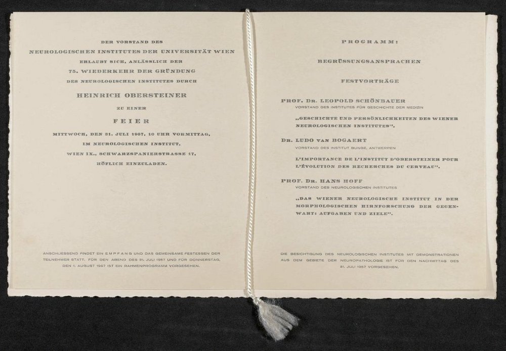 In der Einladung sind die Festvorträge von Leopold Schönbauer, Hans Hoff und Ludo van Bogaert erwähnt. Das vormalige Institut für Neurologie, heute die Abteilung für Neuropathologie und Neurochemie (NPNC), ist eine Subeinheit der Universitätsklinik für Neurologie.