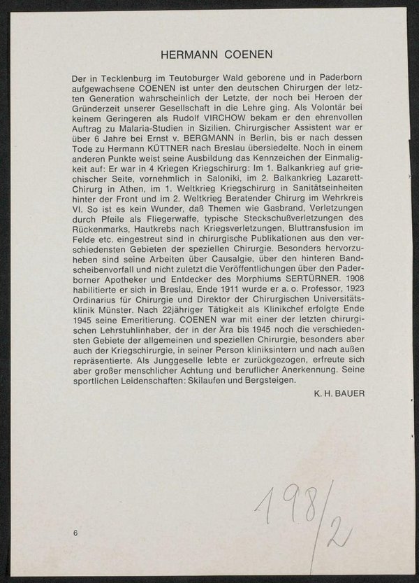 Mit lebensgeschichtlichen Informationen auf der Rückseite. Auszug aus: Die Hundertjährigen Chirurgen des Kongresses 1975, München 1975, S. 5-6.