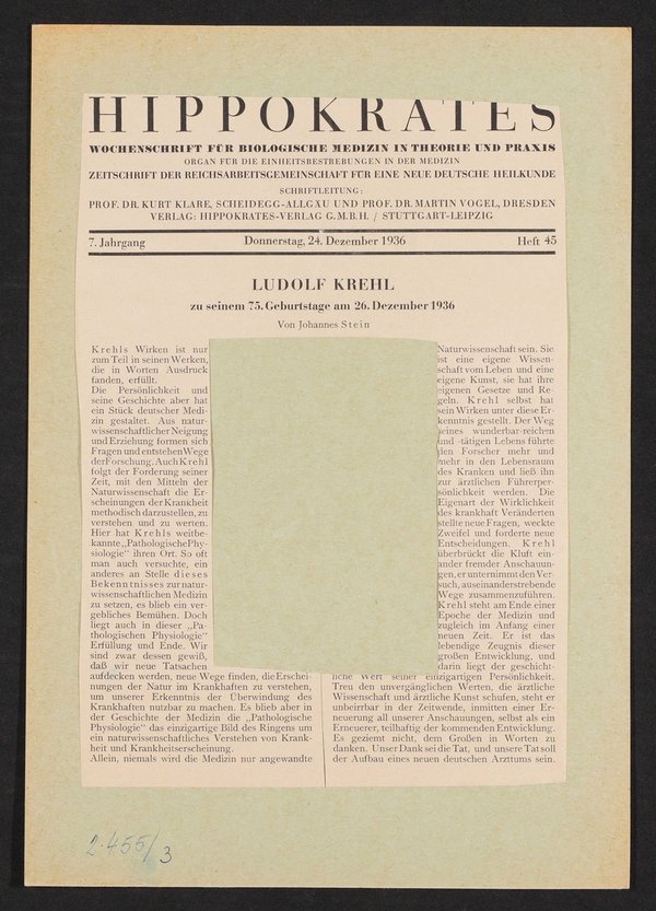 Auszug aus: Hippokrates. Organ für die Einheitsbestrebungen in der Medizin, Nr. 45, 7. Jg., 24. Dezember 1936.