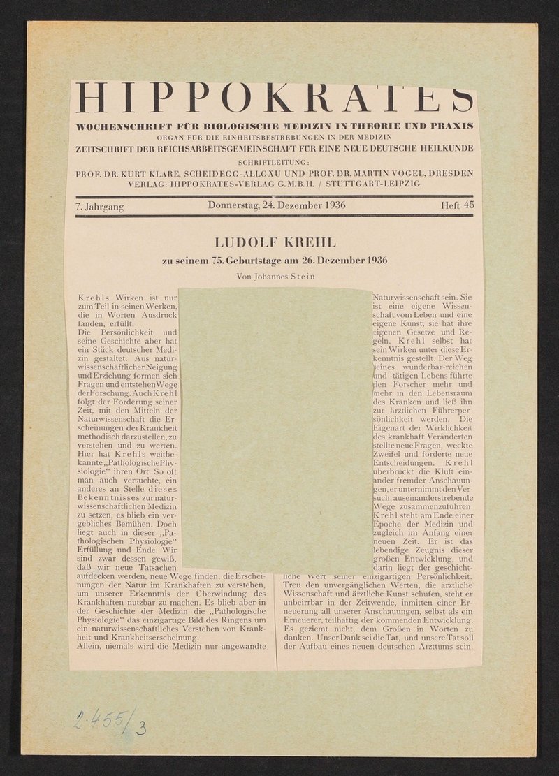 Auszug aus: Hippokrates. Organ für die Einheitsbestrebungen in der Medizin, Nr. 45, 7. Jg., 24. Dezember 1936.