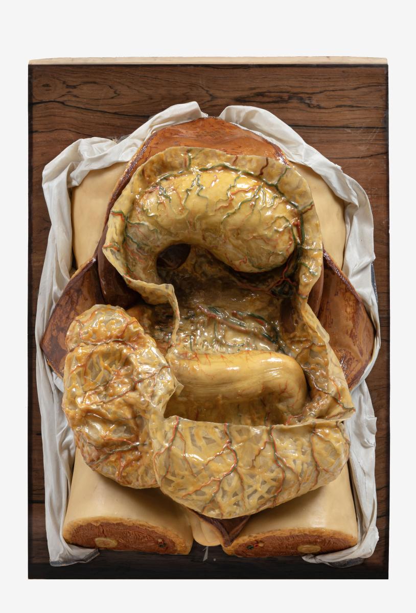 Eröffneter Bauchraum. Um die Ausdehnung der Bursa omentalis und die Lage der Bauchspeicheldrüse zu zeigen, wurde die Verbindung zwischen Colon transversum und Magen (Ligamentum gastrocolicum) durchtrennt und der Magen nach oben geklappt.