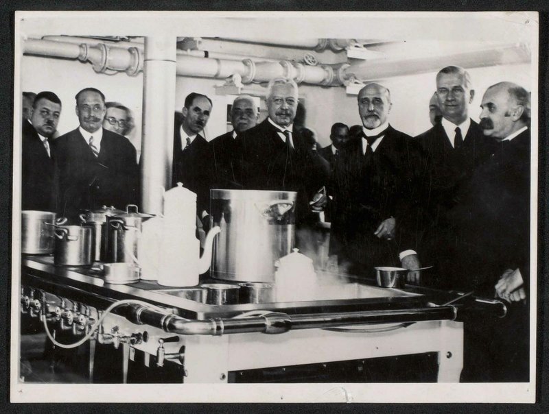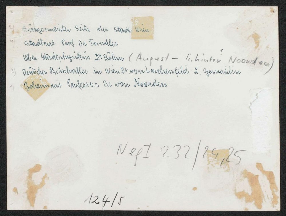 Zu sehen sind: 1. Carl von Noorden; 2. Karl Seitz, Bürgermeister der Stadt Wien; 3. Hugo Graf von und zu Lerchenfeld und Ethel Louise von und zu Lerchenfeld-Köfering; 4. Julius Tandler; 5. August Böhm, links hinter Noorden. Neg I 232/24, 25