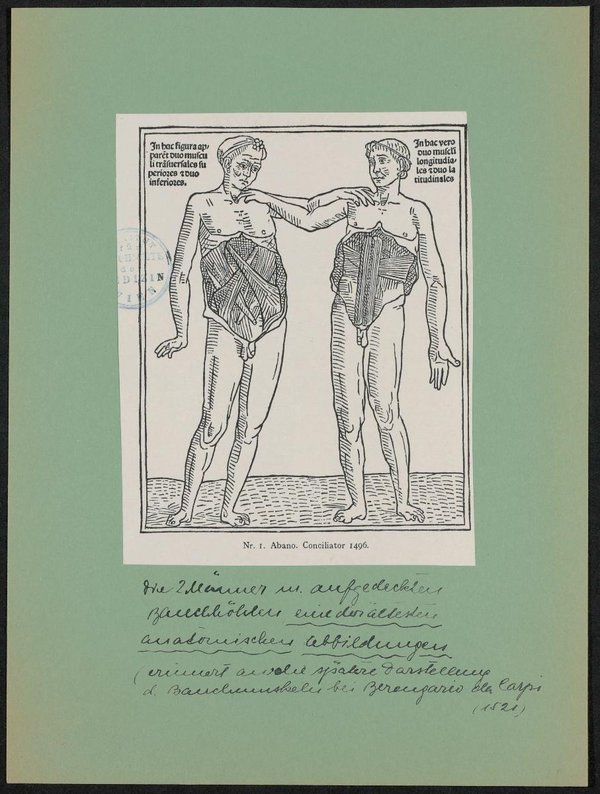 Der Ausschnitt ist aus einer Reproduktion der Schrift Conciliator differentiarum, sophorum, et praecipue medicorum, 1. Ausgabe, 1471, von Pietro d' Abano.