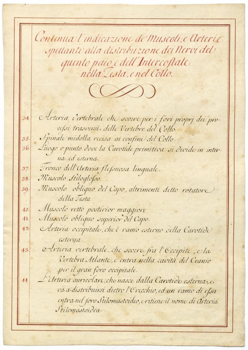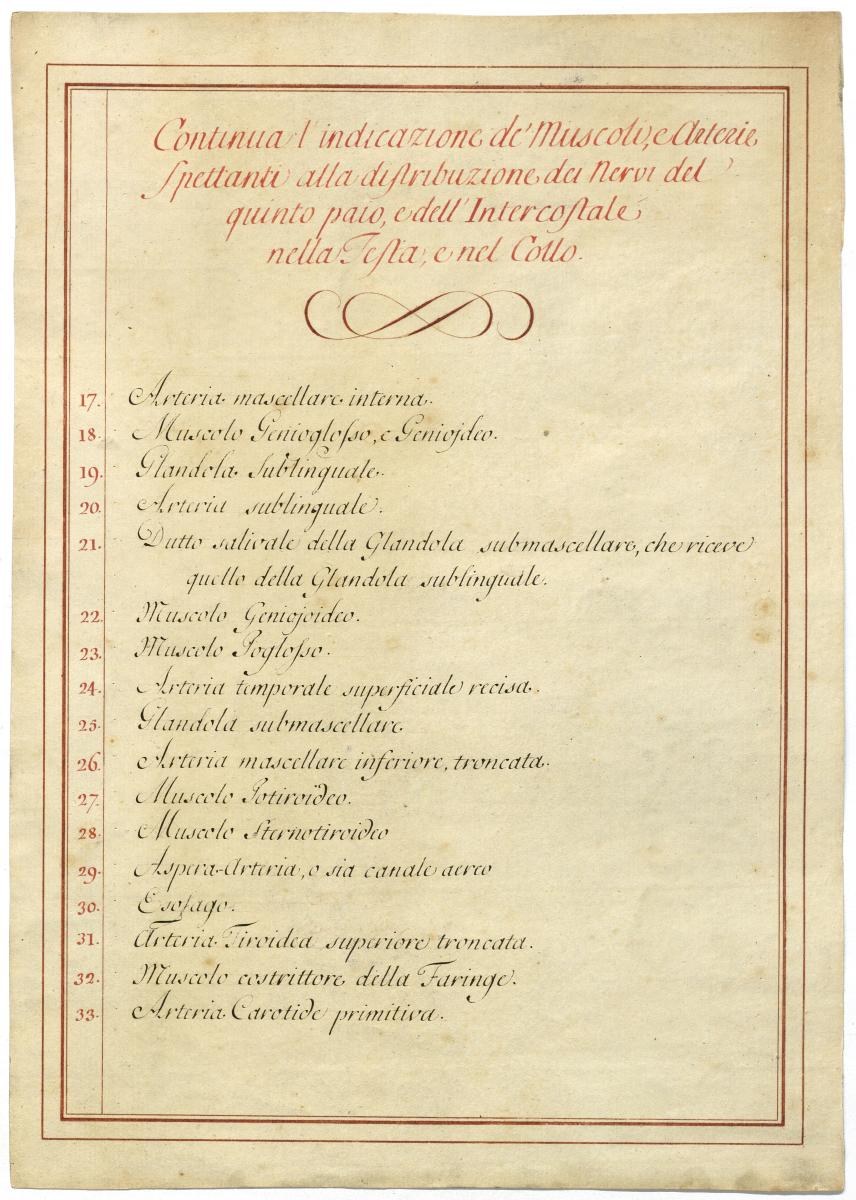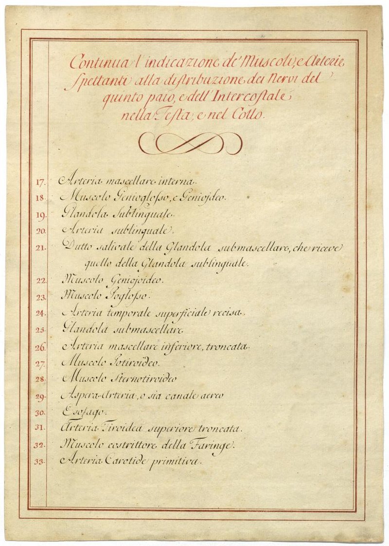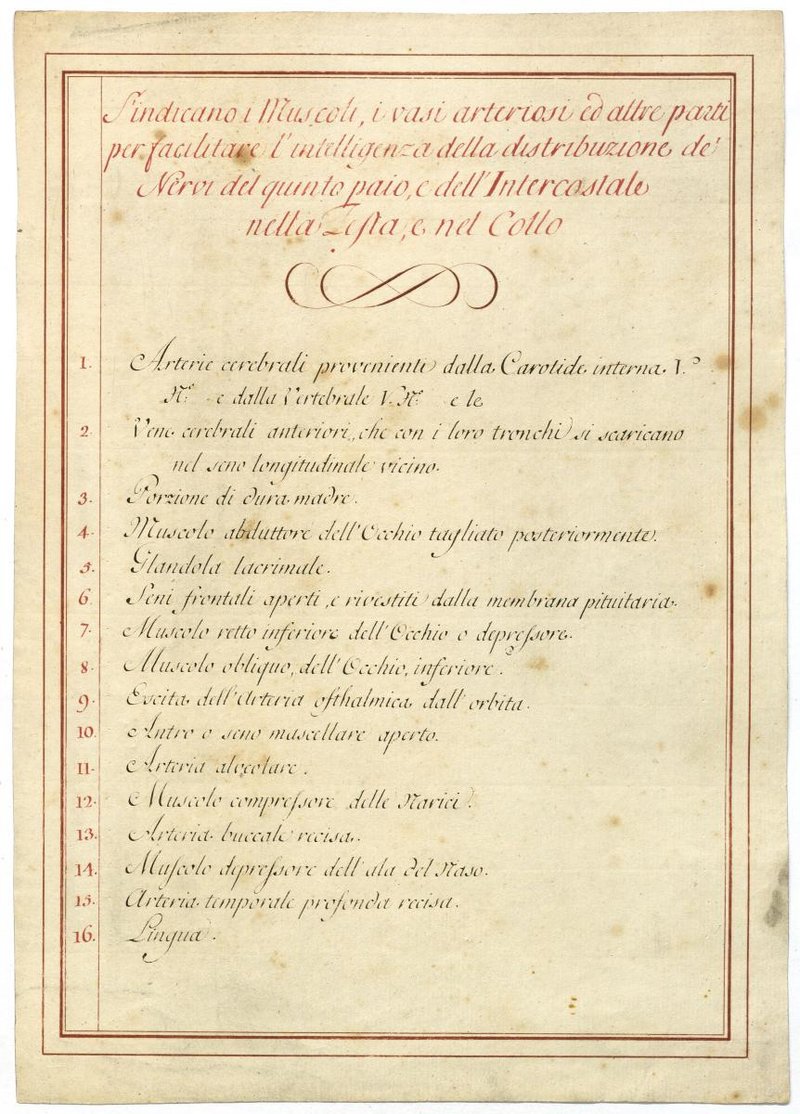 Der Text ist die ergänzende Beschreibung in italienischer Sprache zum anatomischen Wachsmodell der Leitungsbahnen der Kopf-Hals-Region.
