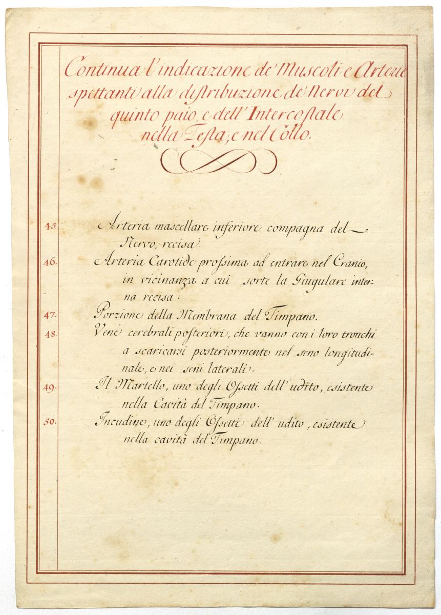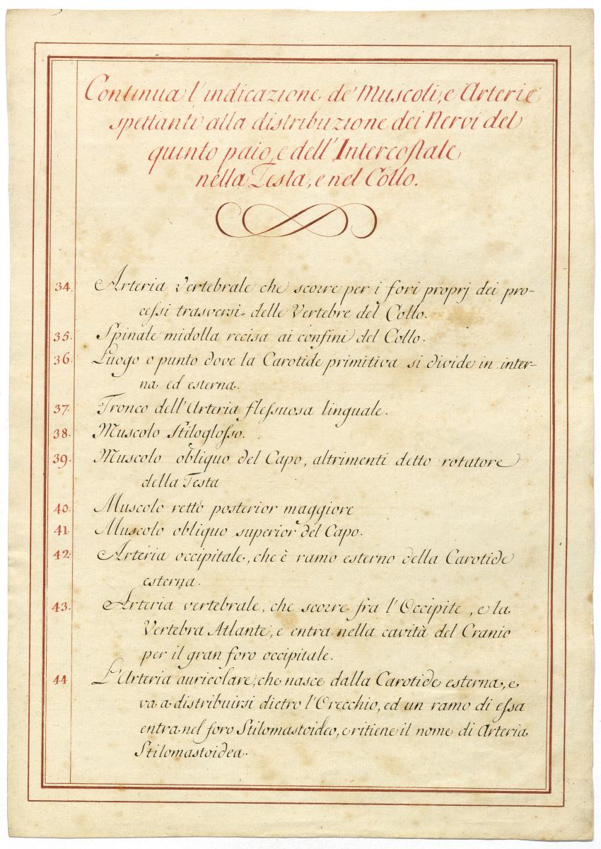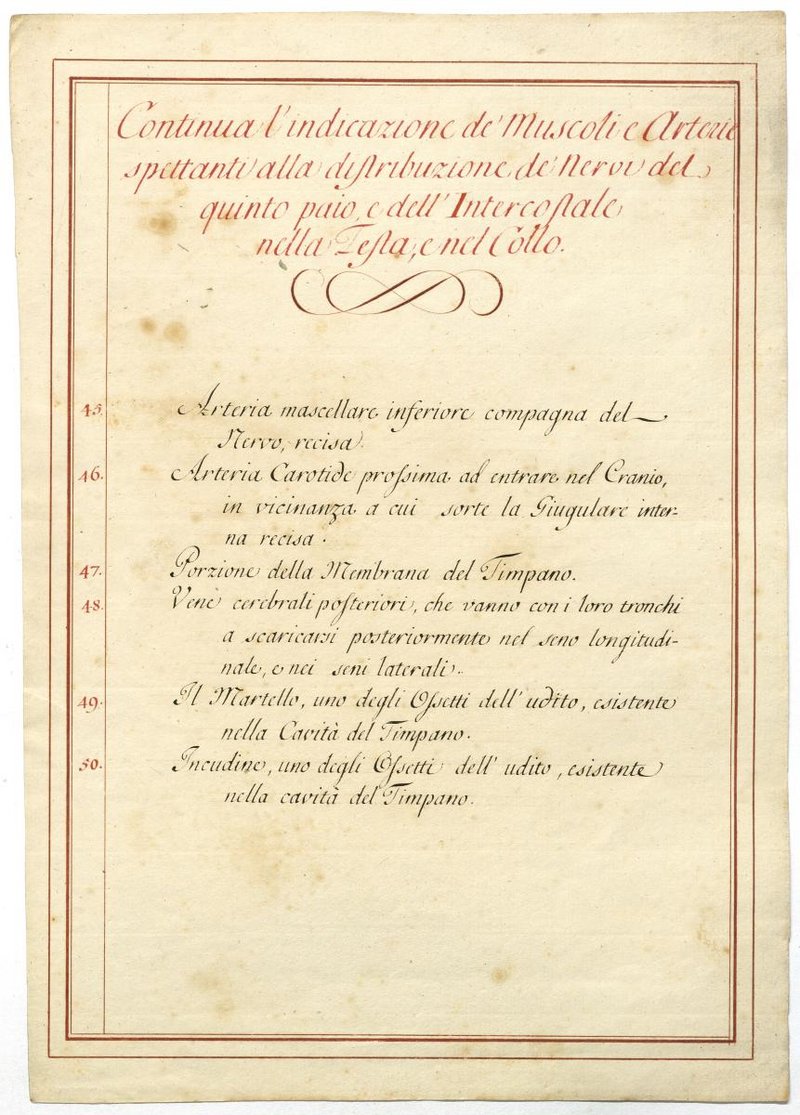 Der Text ist die ergänzende Beschreibung in italienischer Sprache zum anatomischen Wachsmodell der Leitungsbahnen der Kopf-Hals-Region.