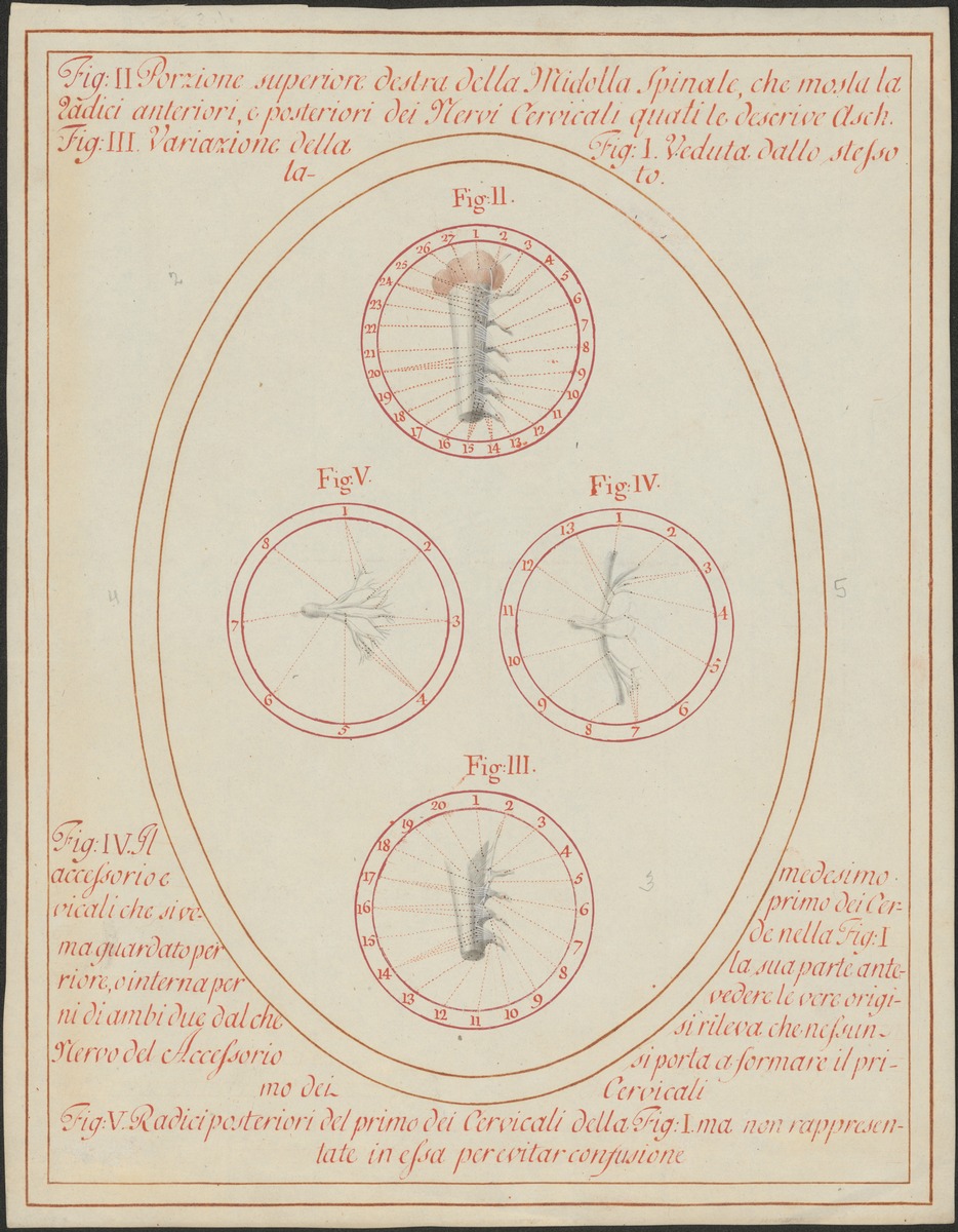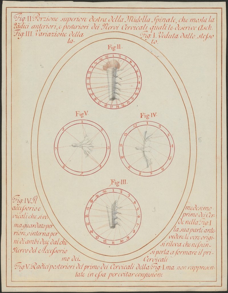 Fig. 2: 275/2: Darstellung der vorderen und hinteren Wurzeln der ersten sechs Nerven des Halsmarks (Radices ventrales et radices dorsales nervorum spinalium cervicis). Fig. 3: 275/3: Die Wurzeln der ersten vier Halsnerven (Radices ventrales et radices dorsales nervorum spinalium cervicis) und die spinalen Wurzeln 11. Hirnnervs (Radices spinales nervi accessorii). Fig. 4: 275/5: Die spinalen Wurzeln des 11. Hirnnervs und die Wurzeln des ersten Halsnerven (Radices spinales nervi accessorii et radix nervi cervicalis I.), von vorne. Fig. 5: 275/4: Die hintere Wurzel des ersten Halsnerven (Radix dorsalis nervi cervicalis I.).