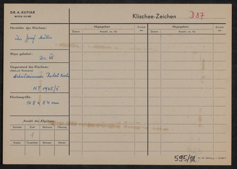 Angebracht an einem Informationsbogen zur Übernahme von Klischees. Das dazugehörige Klischee (Klischee 8) befindet sich im Bildarchiv des Josephinums in der Schachtel BS 138.