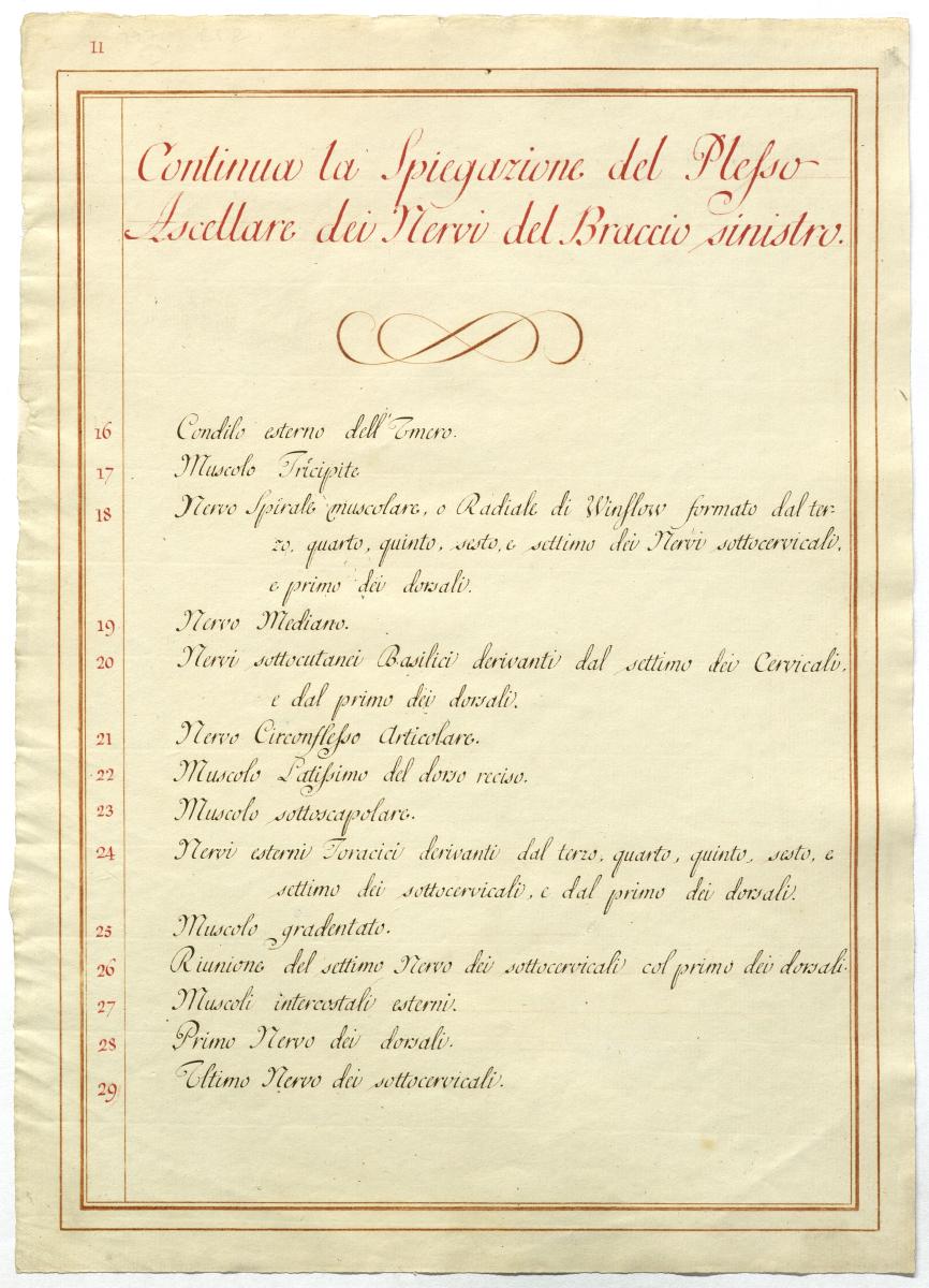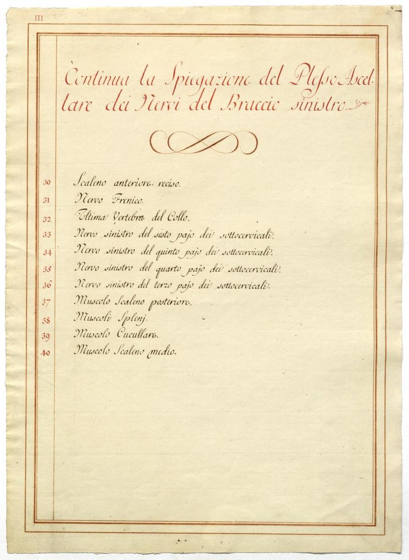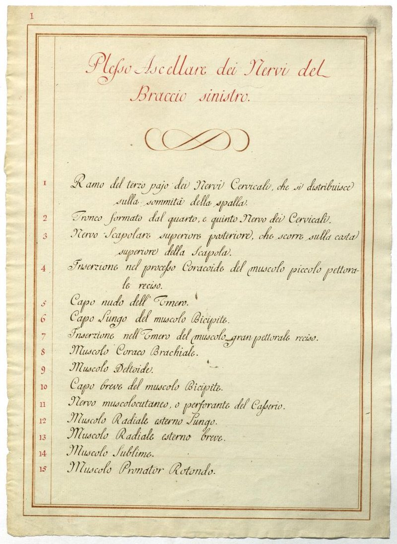 Der Text ist die ergänzende Beschreibung in italienischer Sprache zum anatomischen Wachsmodell des Plexus brachialis.