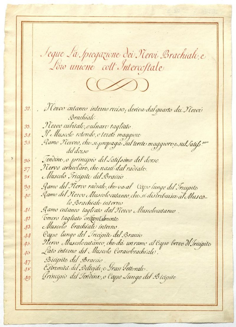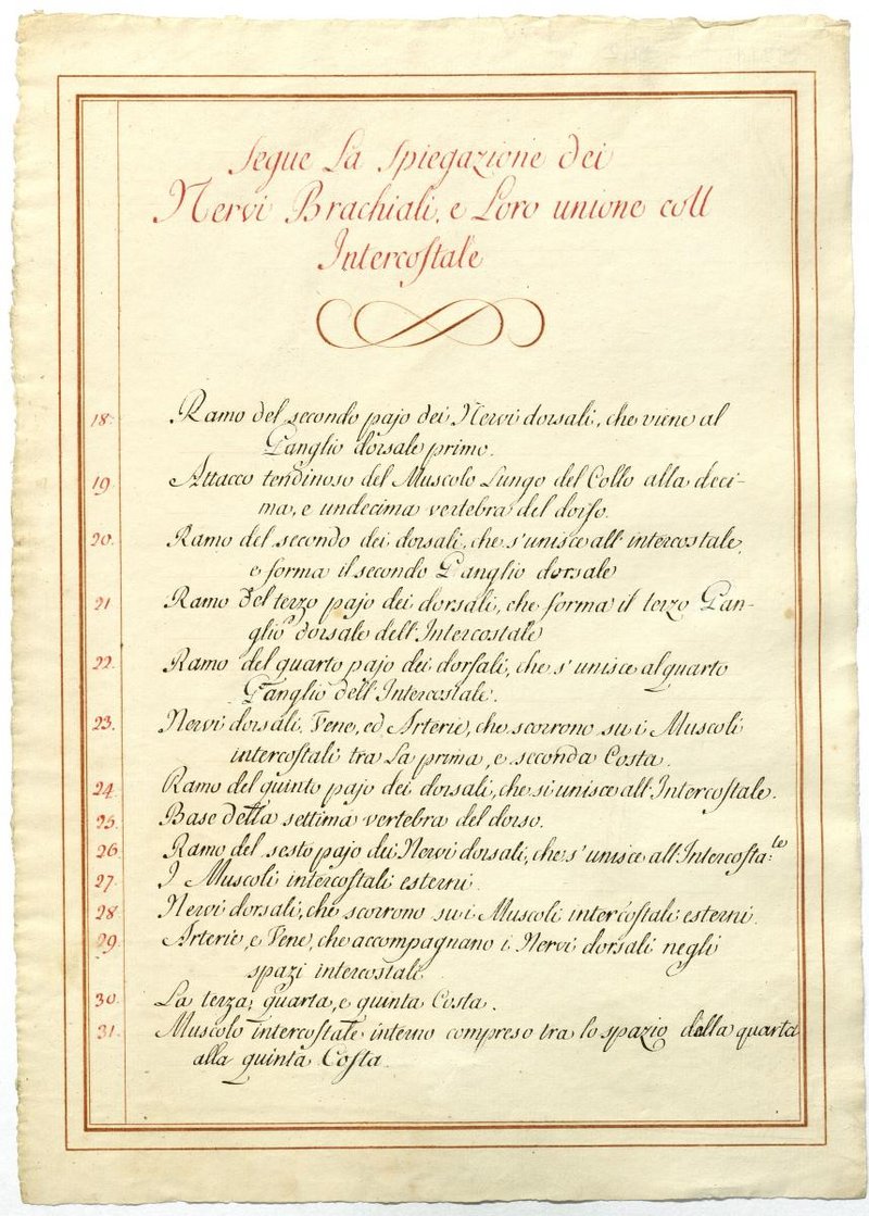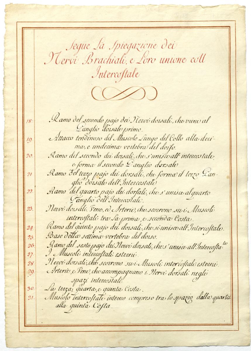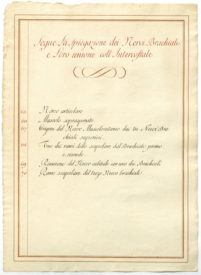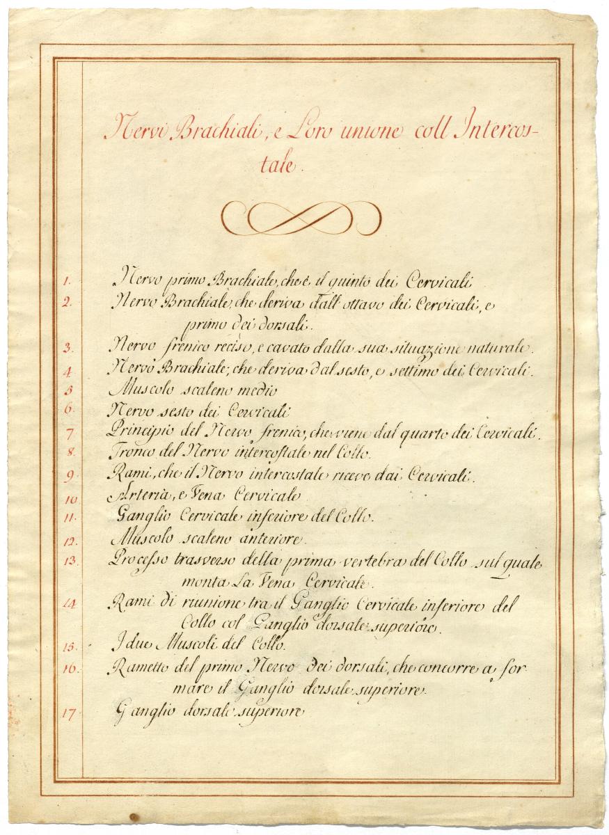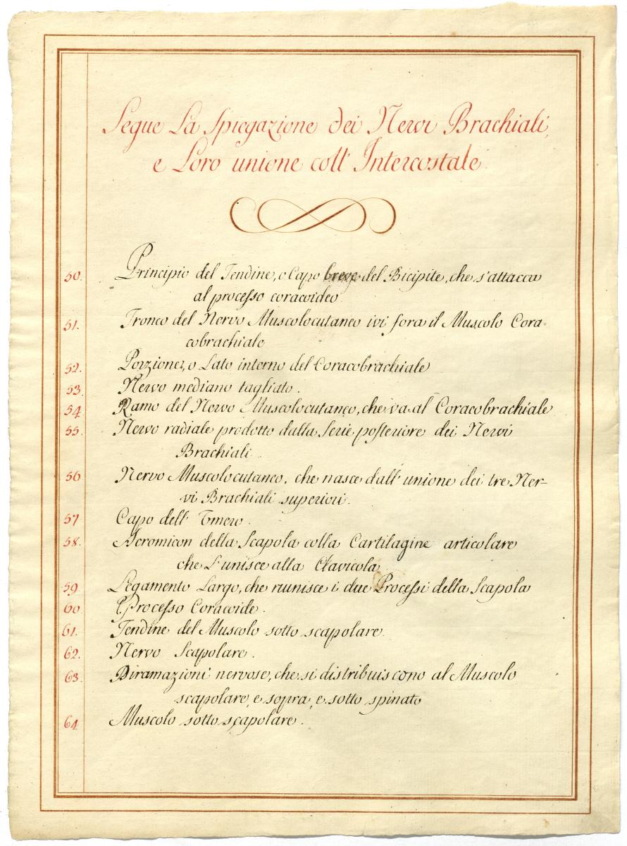 Der Text ist die ergänzende Beschreibung in italienischer Sprache zum anatomischen Wachsmodell des Plexus brachialis.