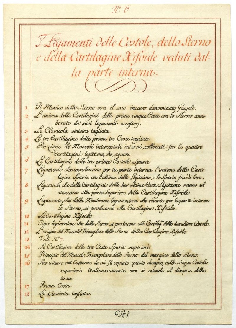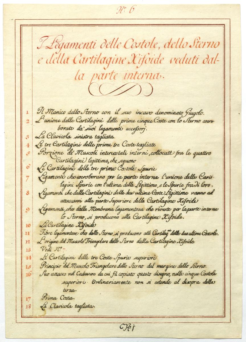 Der Text ist die ergänzende Beschreibung in italienischer Sprache zum anatomischen Wachsmodell des Brustbeines und der Rippen.