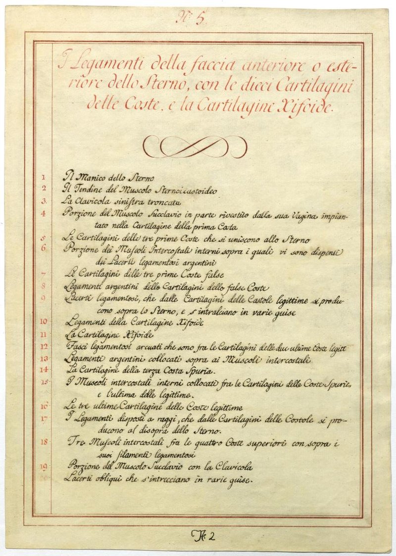 Der Text ist die ergänzende Beschreibung in italienischer Sprache zum anatomischen Wachsmodell des Brustbeines und der Rippen.