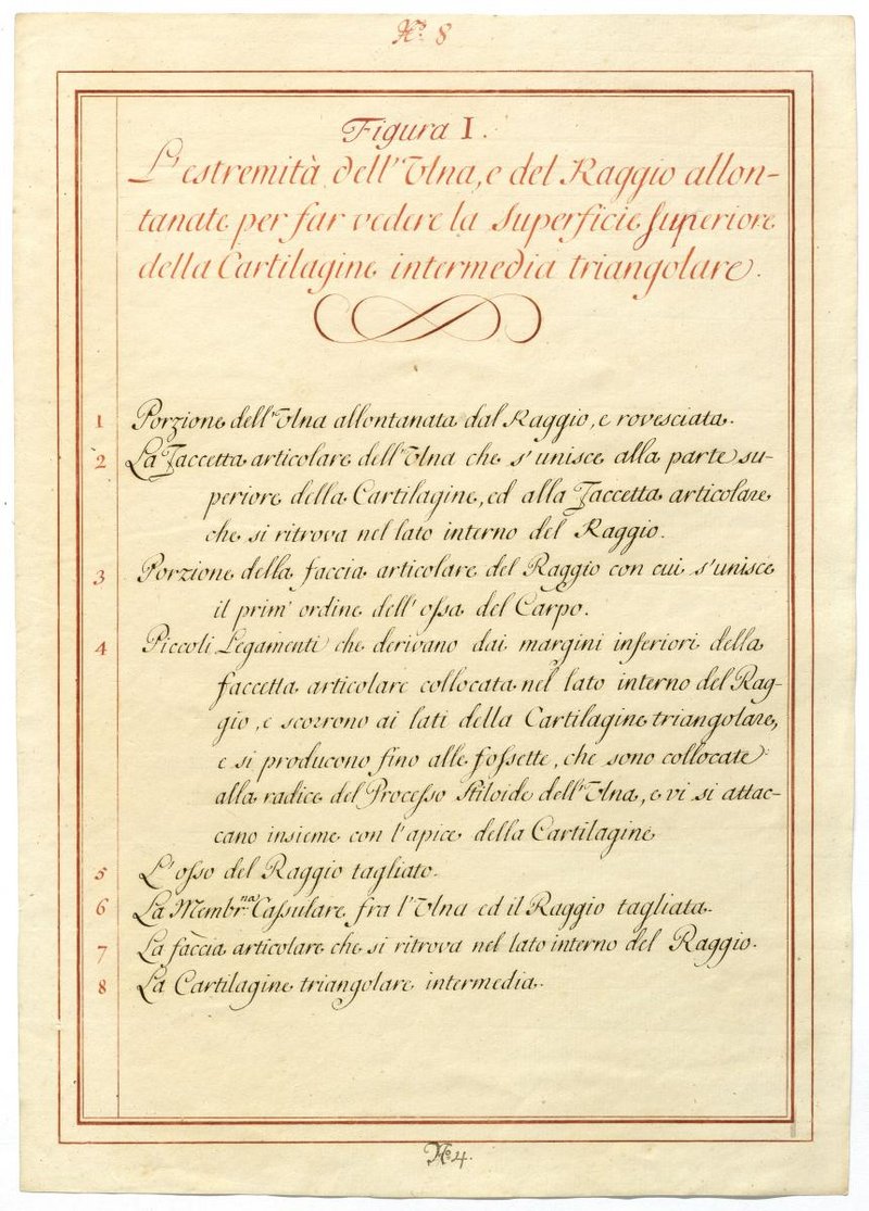 Der Text ist die ergänzende Beschreibung in italienischer Sprache zum anatomischen Wachsmodell des Unterarms, Ellenbogens und Handgelenks.
