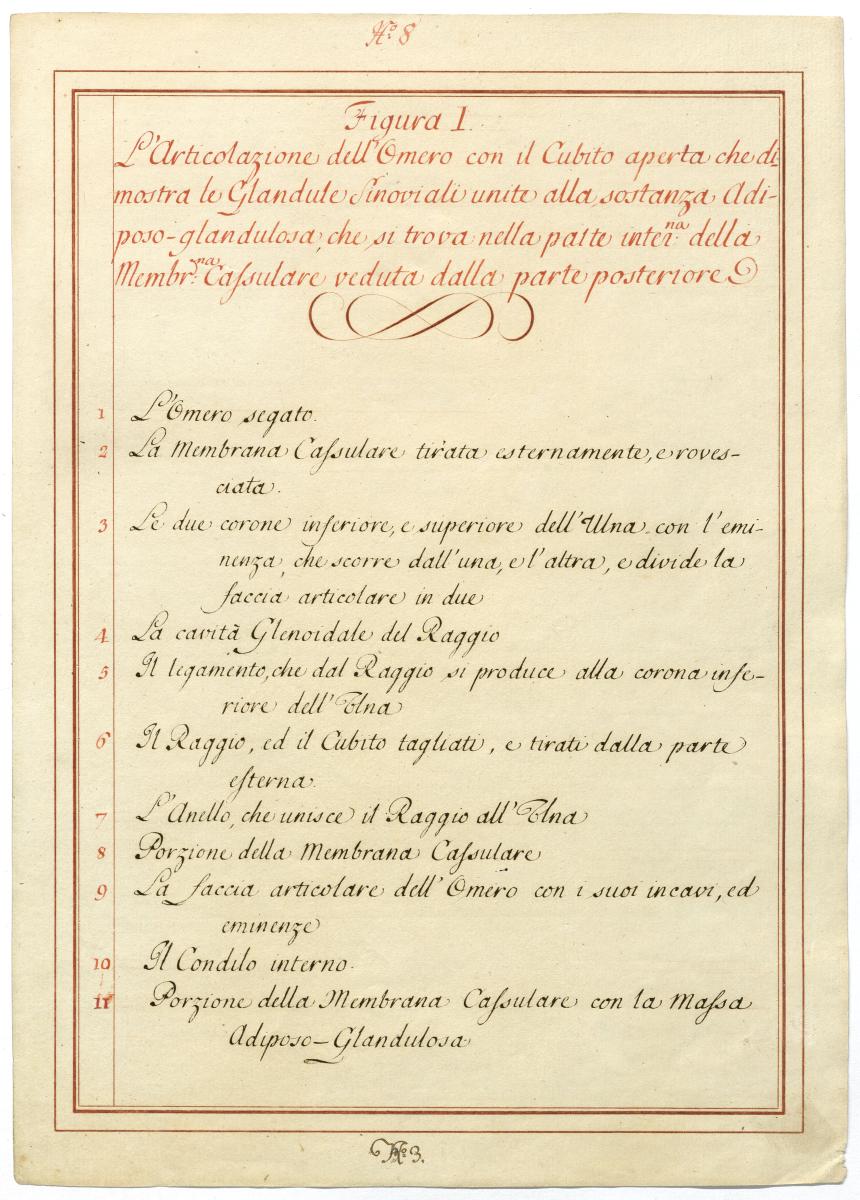 Der Text ist die ergänzende Beschreibung in italienischer Sprache zum anatomischen Wachsmodell des Unterarms, Ellenbogens und Handgelenks.