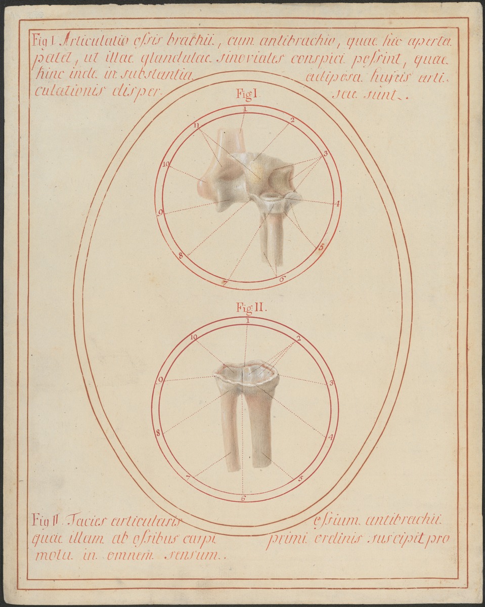 Fig. 1: 8/2: Das aufgeklappte Ellbogengelenk (Articulatio cubiti) von posterior mit den einzelnen knorpelüberzogenen Gelenkanteilen. Die Speiche (Radius) ist weiterhin über das Ringband der Speiche (Ligamentum anulare radii) mit der Elle (Ulna) verbunden. Fig 2: 8/5: Die den Handwurzelknochen zugewandte Gelenkfläche der Speiche (Facies articularis carpea [radii]) und die dreieckige Gelenkscheibe des Handgelenkes (Discus articularis bzw. Discus triangularis).