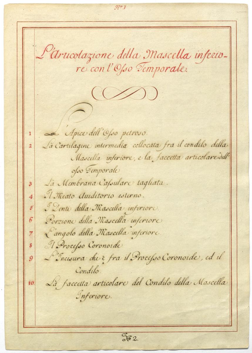 Der Text ist die ergänzende Beschreibung in italienischer Sprache zum anatomischen Wachsmodell der Kiefergelenke.