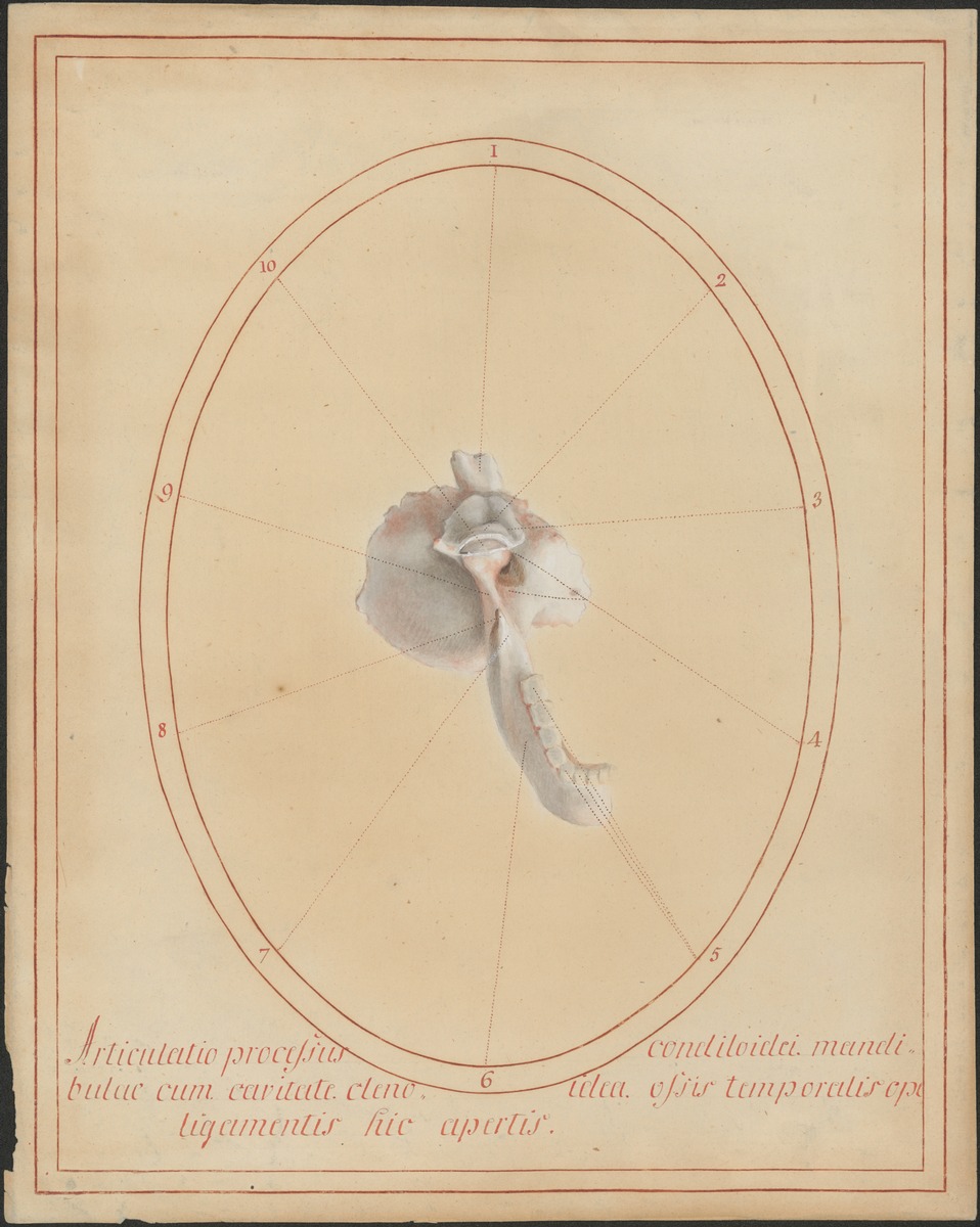 Isoliertes Modell aus einem Teil des Schläfenbeins (Os temporale) und einem Teil des Unterkieferknochens (Mandibula). Das eröffnete Kiefergelenk (Articulatio temporomandibularis) und dessen Gelenkscheibe (Discus articularis) in einer maximalen künstlichen Abduktionsstellung.