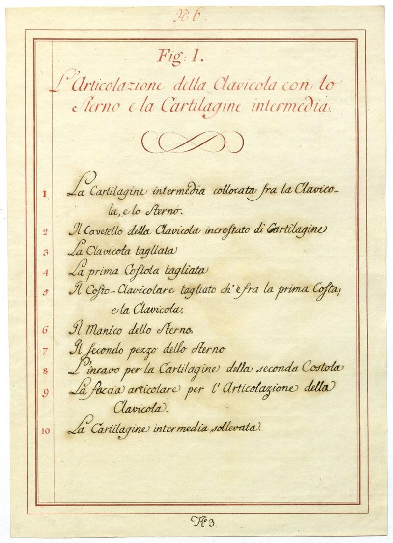 Der Text ist die ergänzende Beschreibung in italienischer Sprache zum anatomischen Wachsmodell des Brustbeines und der Rippen.
