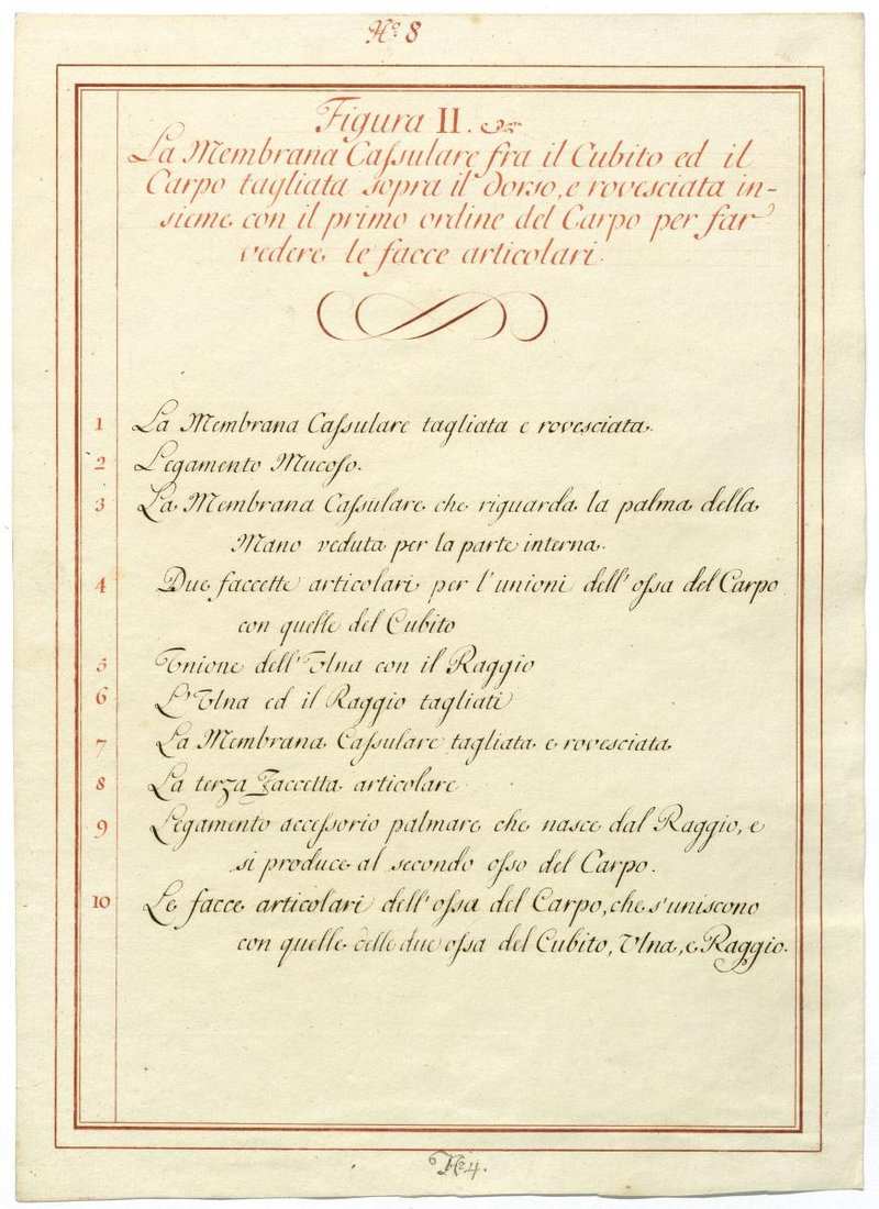 Der Text ist die ergänzende Beschreibung in italienischer Sprache zum anatomischen Wachsmodell des Unterarms, Ellenbogens und Handgelenks.