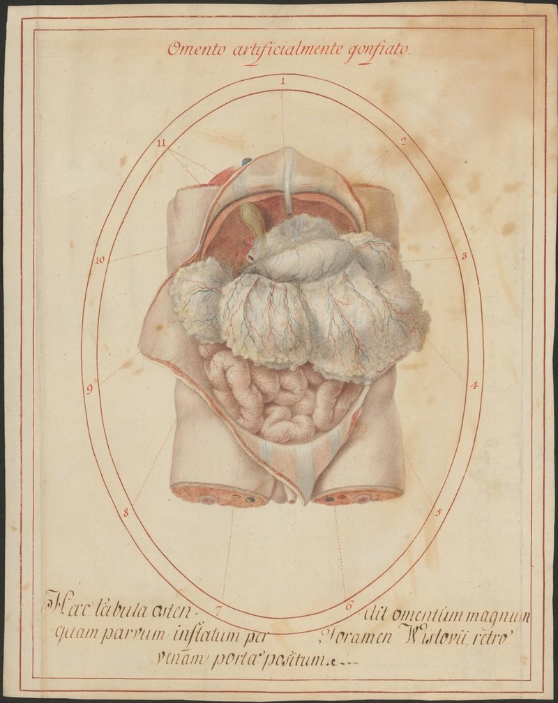 Eröffneter Bauchraum, die Leber ist nach oben geklappt. Das große Netz (Omentum majus) mit seiner Befestigung an der an der großen Magenkurvatur und das kleine Netz (Omentum minus) zwischen kleiner Magenkurvatur und Leber mit dem Zugang zum Foramen epiploicum [Winslowi] (künstlich aufgebläht).