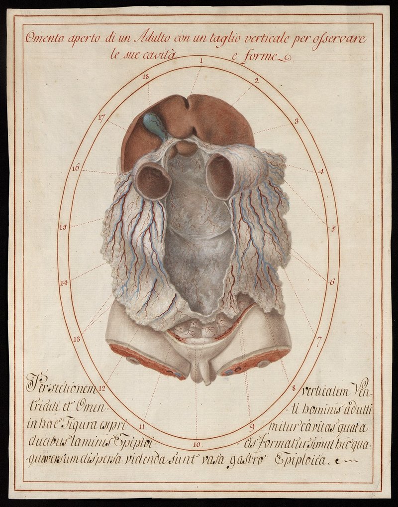 Eröffneter Bauchraum, die Leber ist nach oben geklappt. Um die Ausdehnung der Bursa omentalis zu zeigen, wurde ein mittiger Streifen aus großem und kleinem Netz (Omentum majus und Omentum minus), sowie Magen (Ventriculus) entfernt.